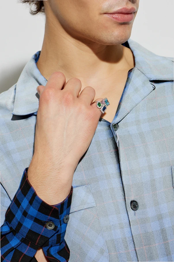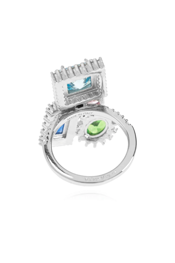 Pierścień z cyrkoniami sygnowany renomą Maison Margiela emanuje wyrafinowaną formą i wysublimowaną kompozycją barw. Masywny, geometryczny kształt tego srebrnego arcydzieła intryguje zestawieniem czterech okazałych cyrkonii – centralnej, błękitnej o szlachetnym kwadracie, szlachetnej niebieskiej w kształcie prostokąta, subtelnej różowej o obłym szlifie oraz zmysłowej zielonej w owalnej oprawie.