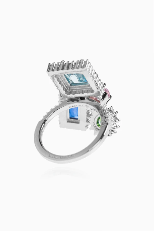 Każdy z kamieni otoczony jest girlandą drobnych, lśniących cyrkonii, które wydobywają niepowtarzalną głębię i roziskrzają pierścień migotliwym blaskiem. Srebrna, rodowana baza z mosiądzu zachwyca starannością wykonania, a widoczny od wewnątrz grawerowany napis potwierdza kunszt projektanta.