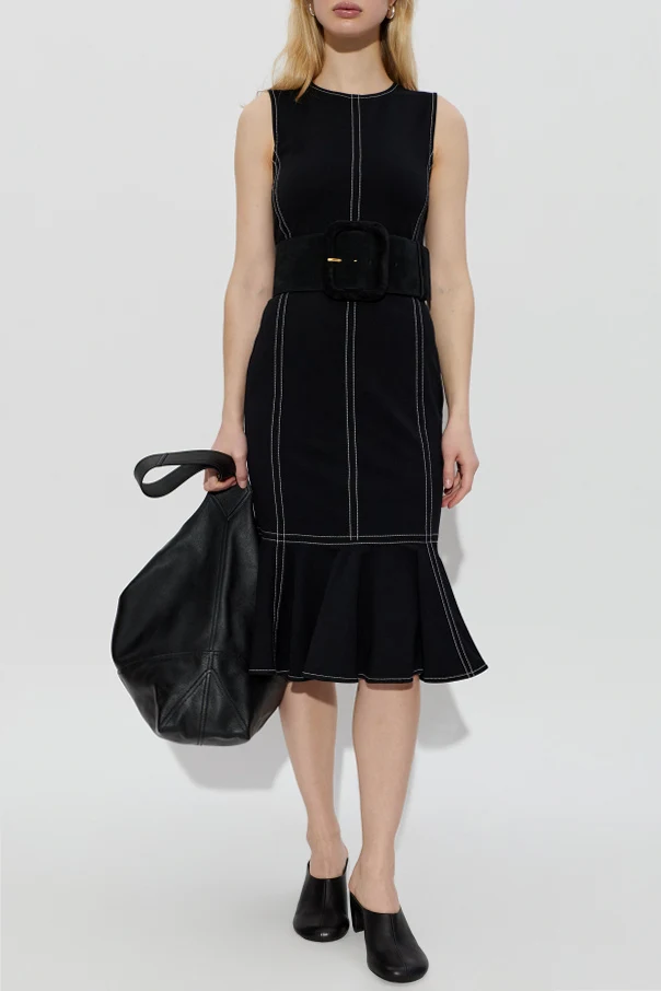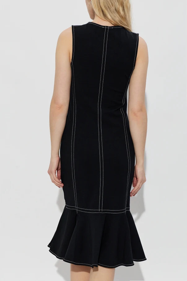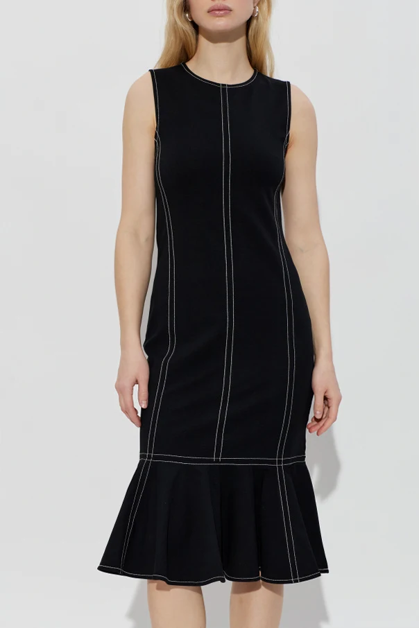 Charakter sukienki podkreślają kontrastowe, białe steppowania, które tworzą wyraźne linie konstrukcyjne i akcentują panelową budowę modelu. Szeroka, rozkloszowana falbana dodaje lekkości oraz szlachetnego wyrazu, a minimalistyczny fason i zabudowany dekolt czynią ten projekt uniwersalnym do wielu stylizacji.