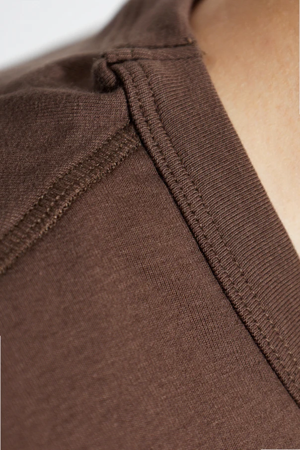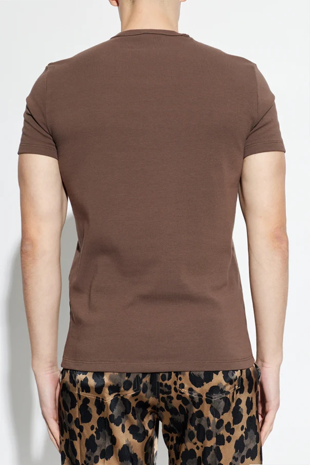 T-shirt bieliźniany autorstwa Tom Ford wyróżnia się nieprzemijającą elegancją klasycznej formy oraz precyzyjnym wykonaniem. Ten model w kolorze brązowym został zaprojektowany z dbałością o detale – od starannych podwójnych szwów na ramionach i kołnierzyku, po delikatną naszywkę przy dolnym szwie, będącą subtelnym akcentem luksusu.