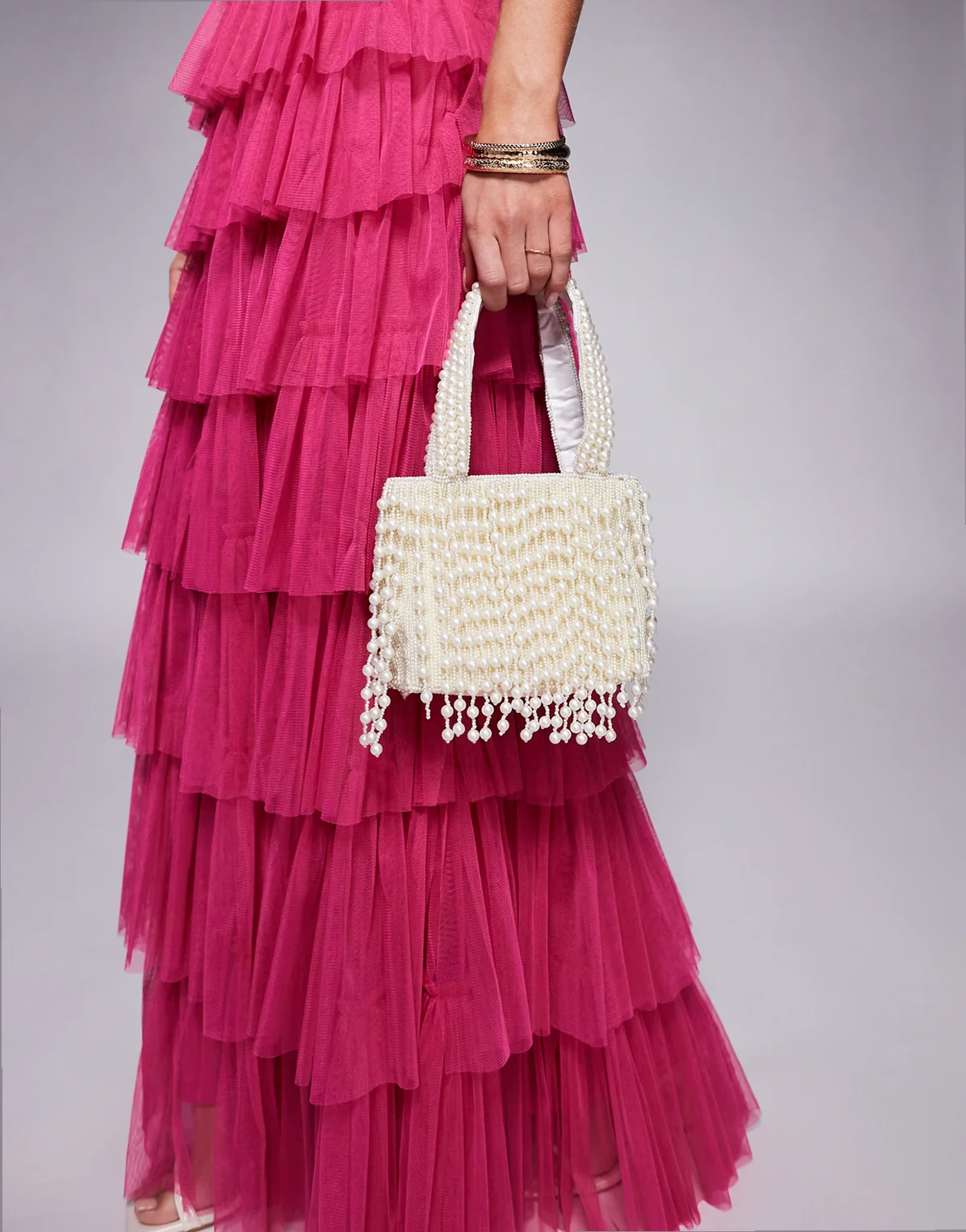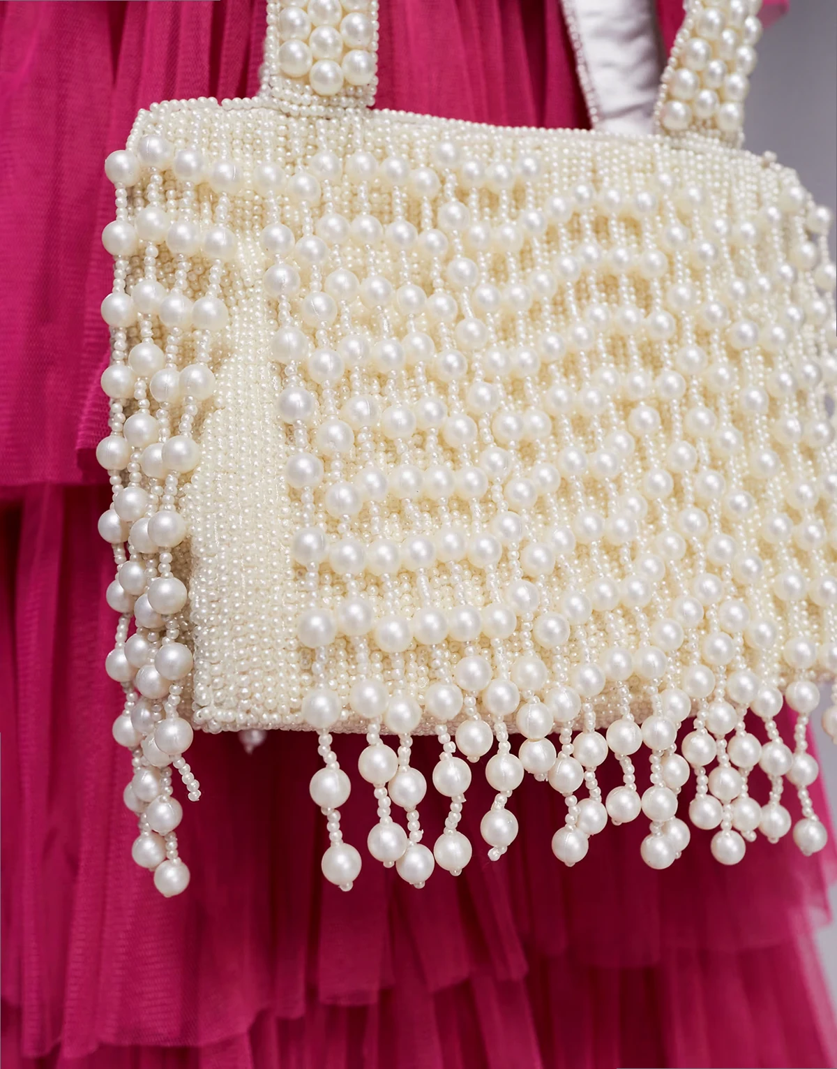 – Biała, ozdobiona koralikami torebka z frędzlami z perełek