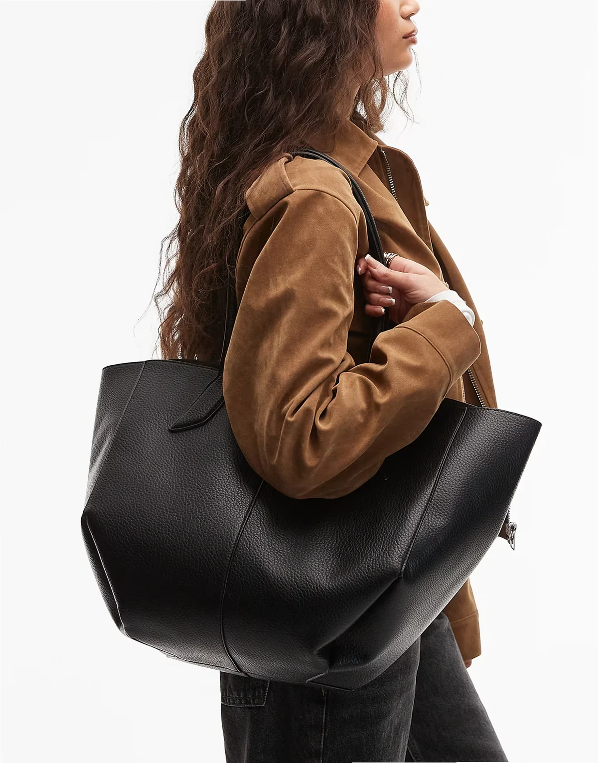 – Luźna brązowa torba typu tote z imitacji zamszu z ozdobnym paskiem