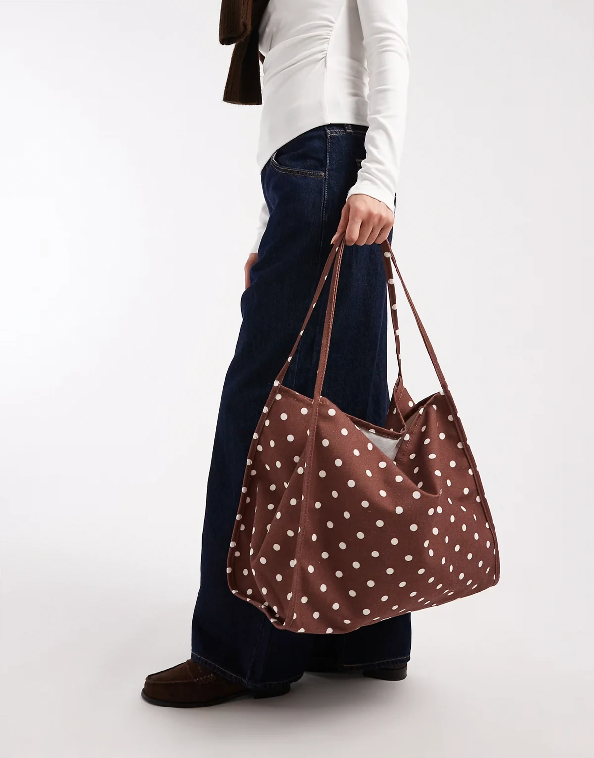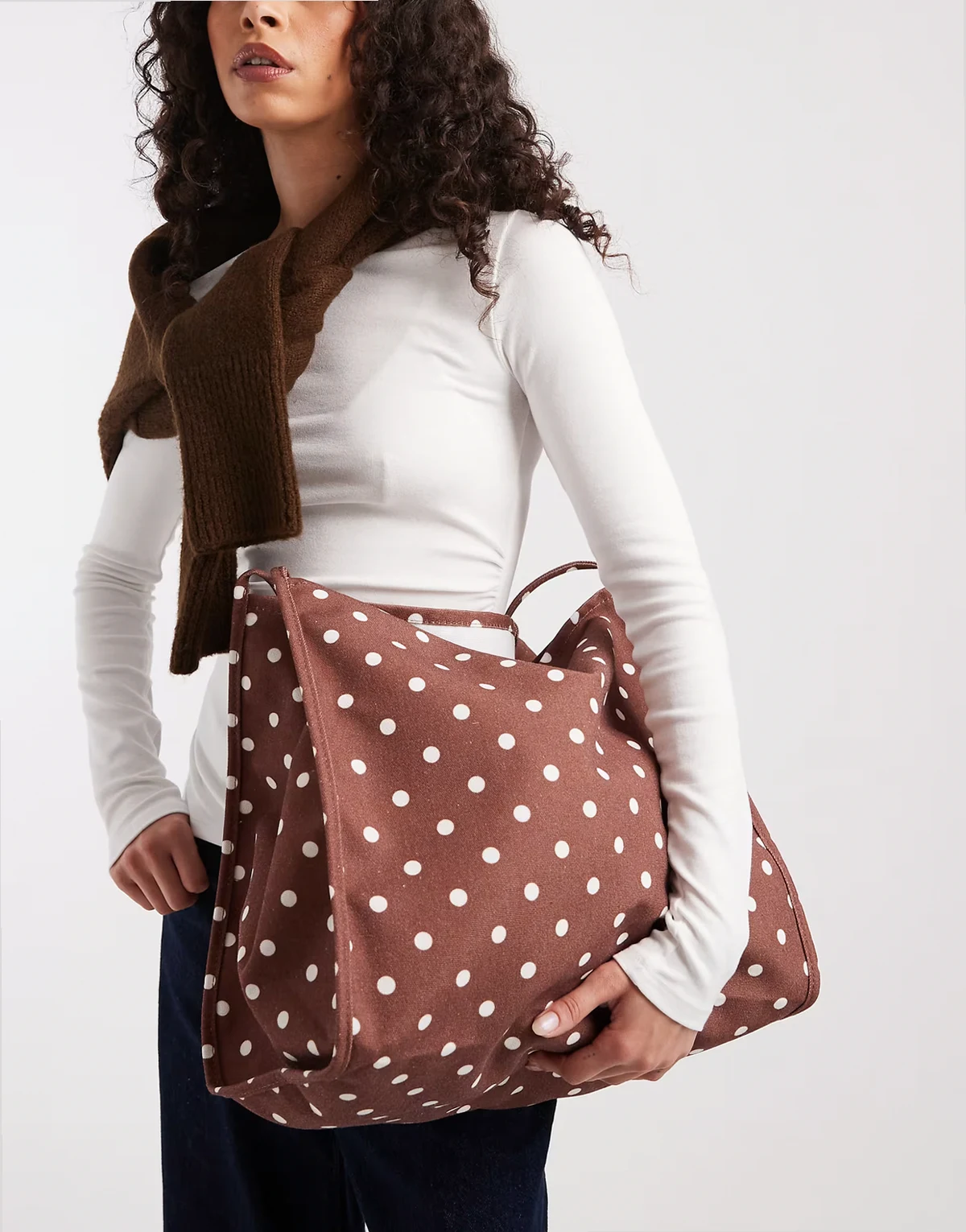– Luźna brązowa torba typu tote z imitacji zamszu z ozdobnym paskiem