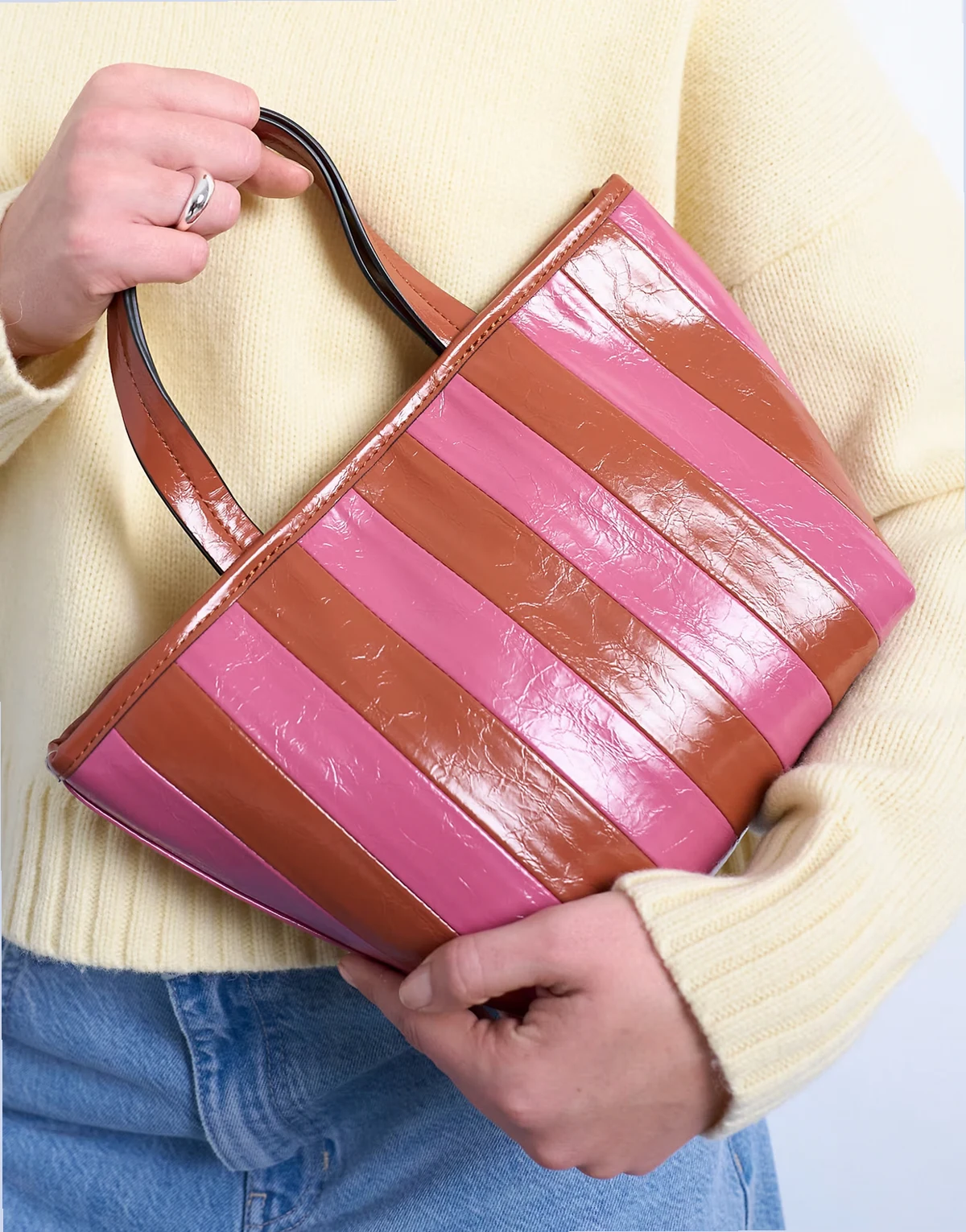 Ta torba została wykonana z lśniącego materiału w paski z fakturowanym wykończeniem. Ma dwa uchwyty i regulowany pasek, co zapewnia wszechstronność noszenia.