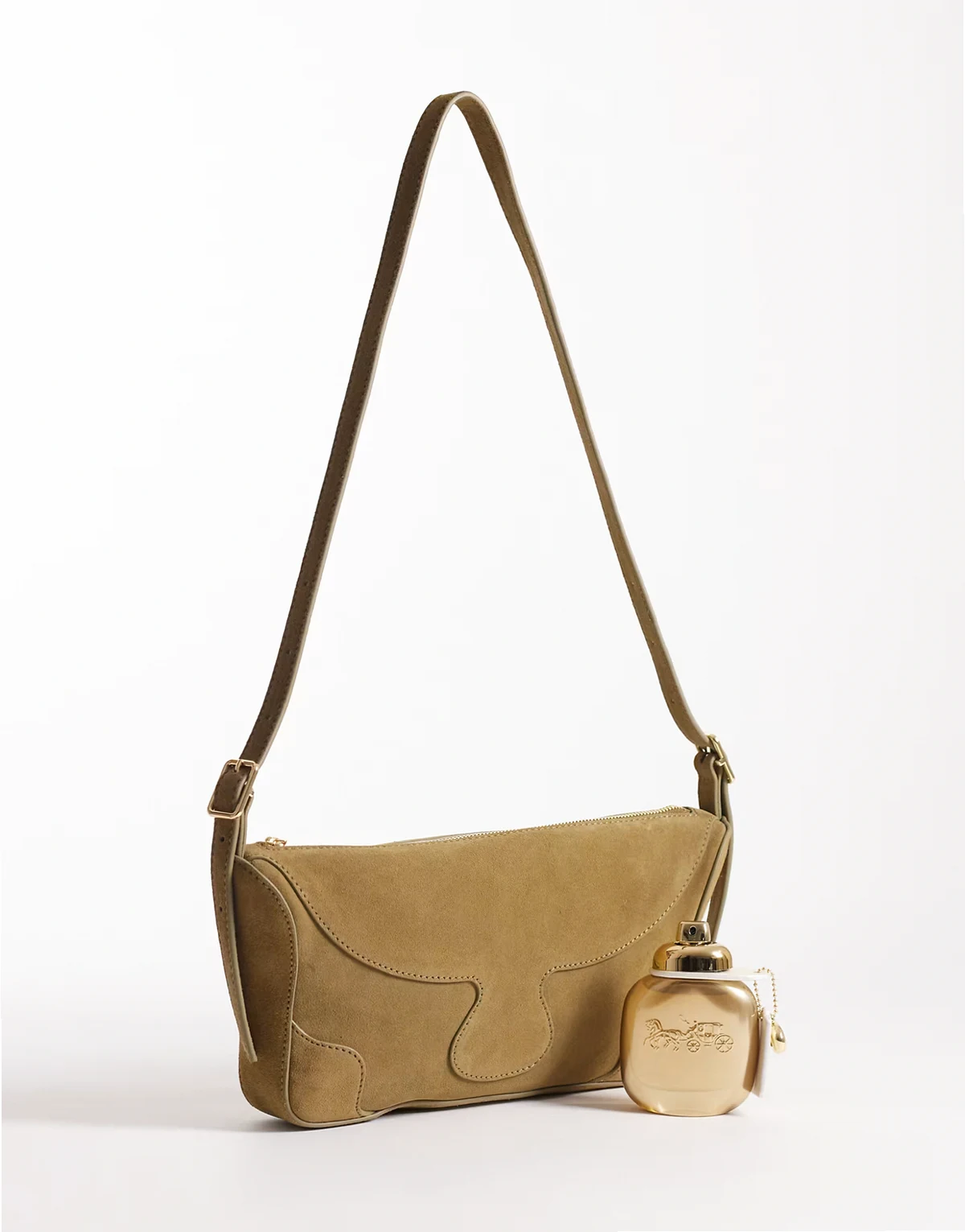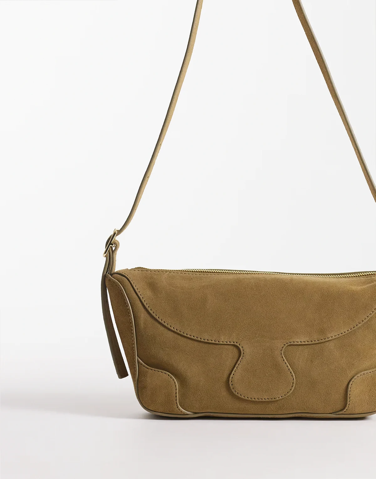 – Beżowa skórzana torebka crossbody z ozdobnymi szwami