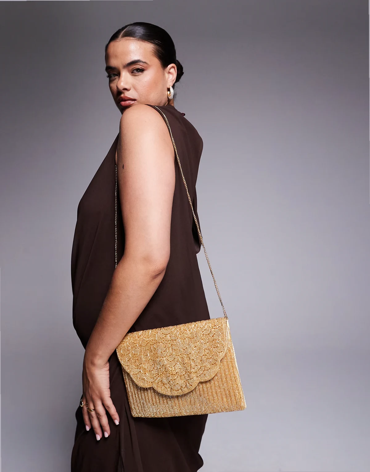 – Złota kopertówka z metalowych koralików na regulowanym pasku