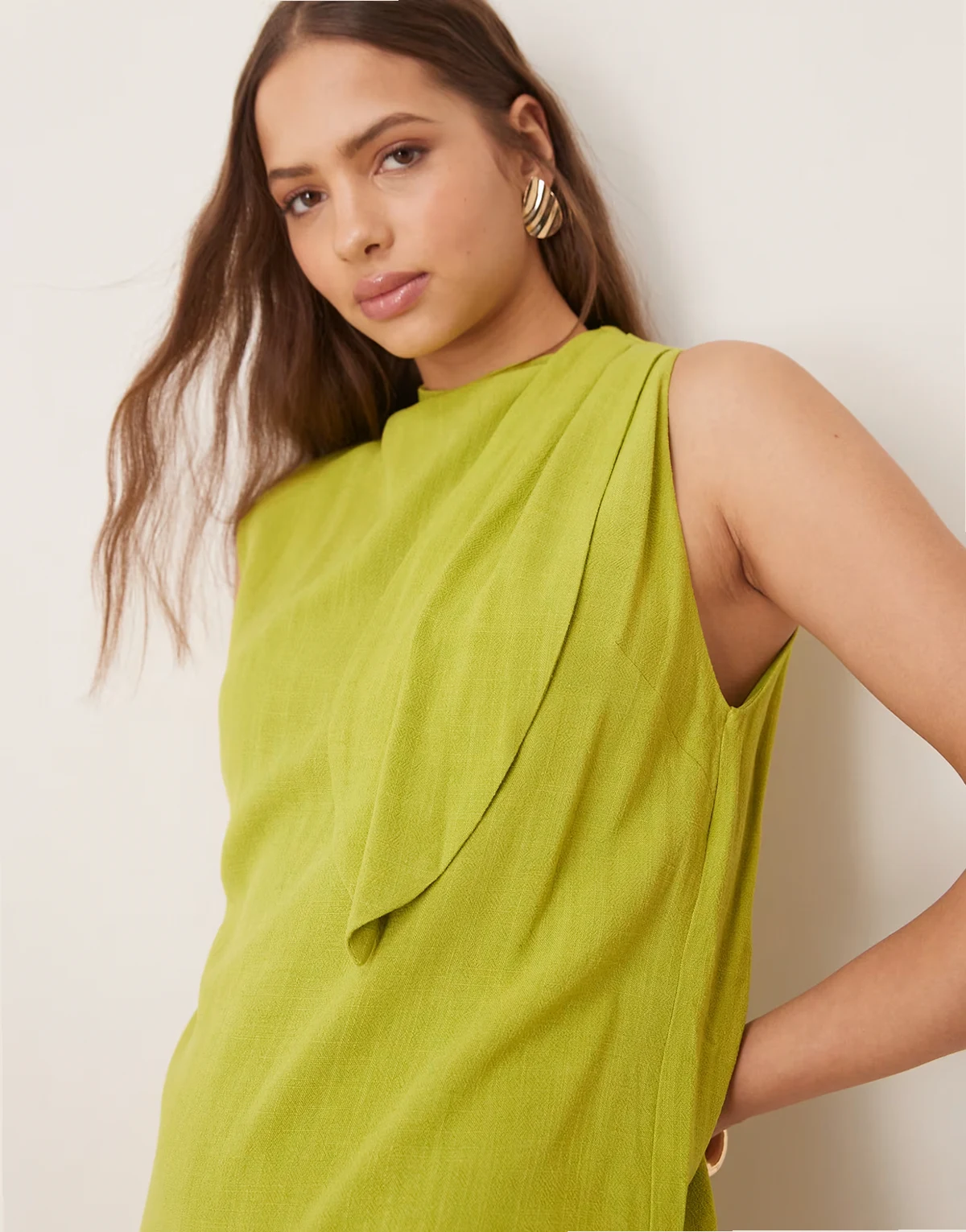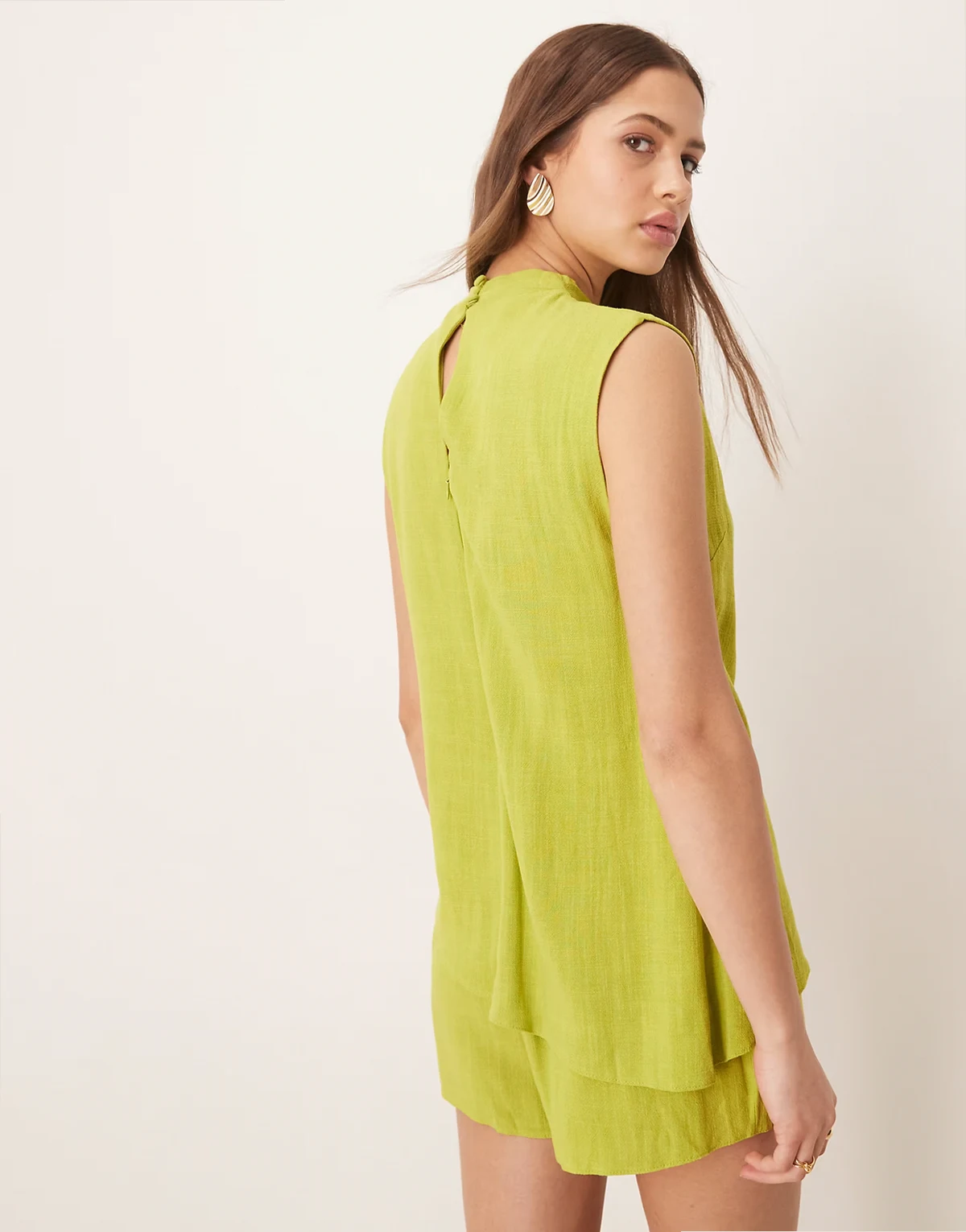 – Wiązany na szyi dwuwarstwowy krótki lniany kombinezon w limonkowozielonym kolorze