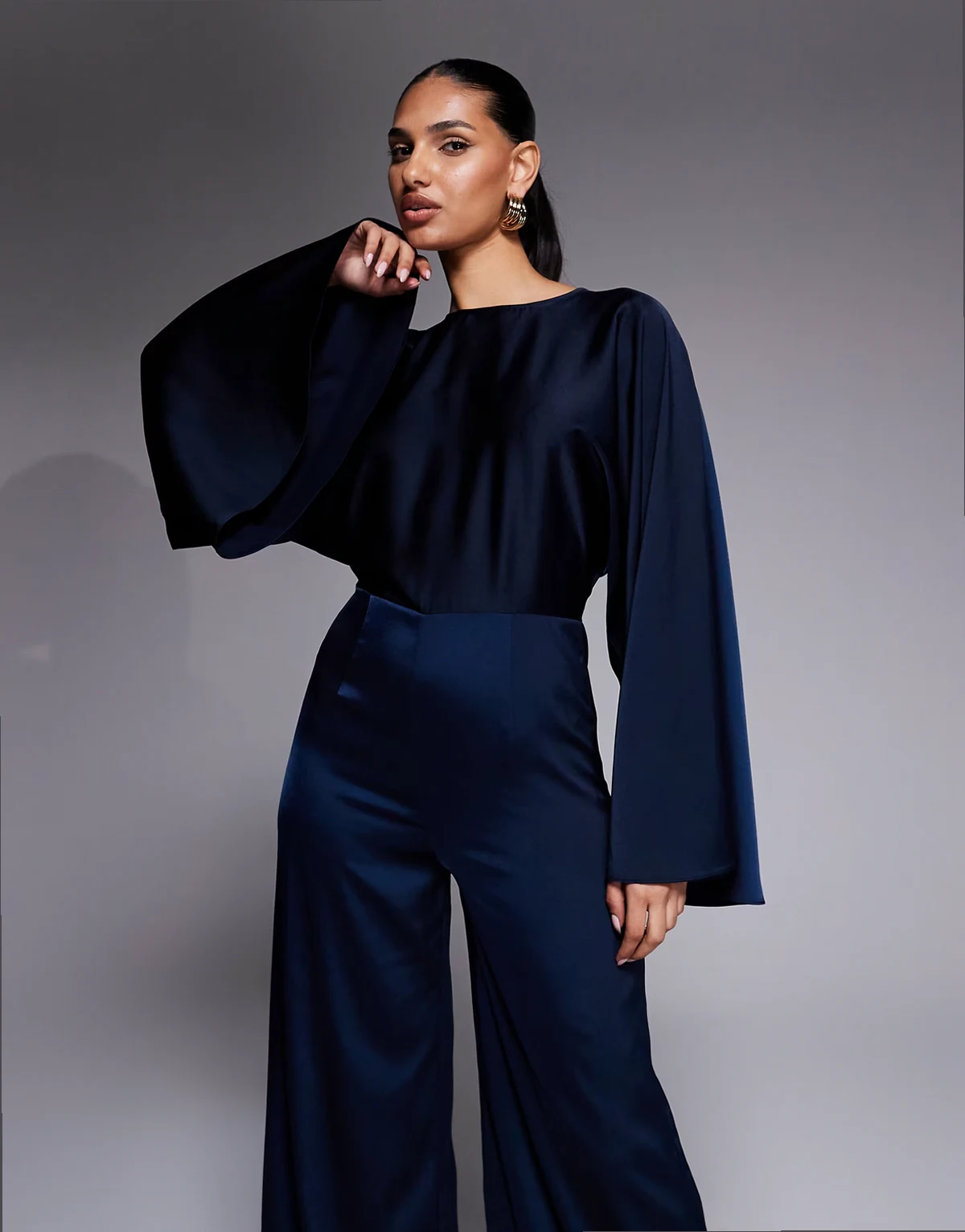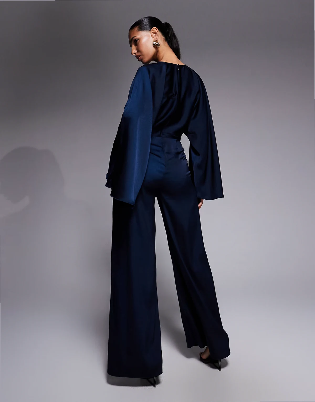 – Granatowy satynowy kombinezon taliowany ze skosu z nietoperzowymi rękawami