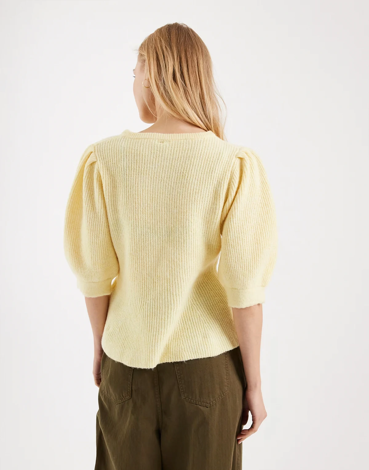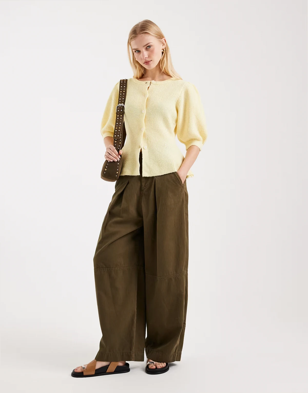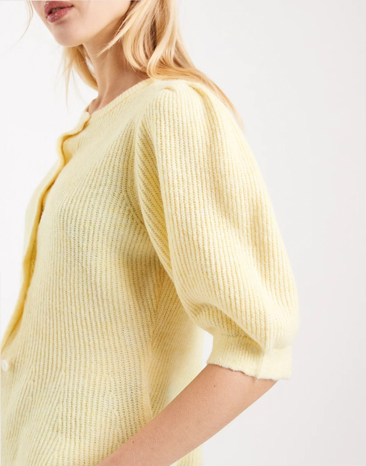 – Jasnożółty dzianinowy kardigan z bufkami i wcięciem w talii