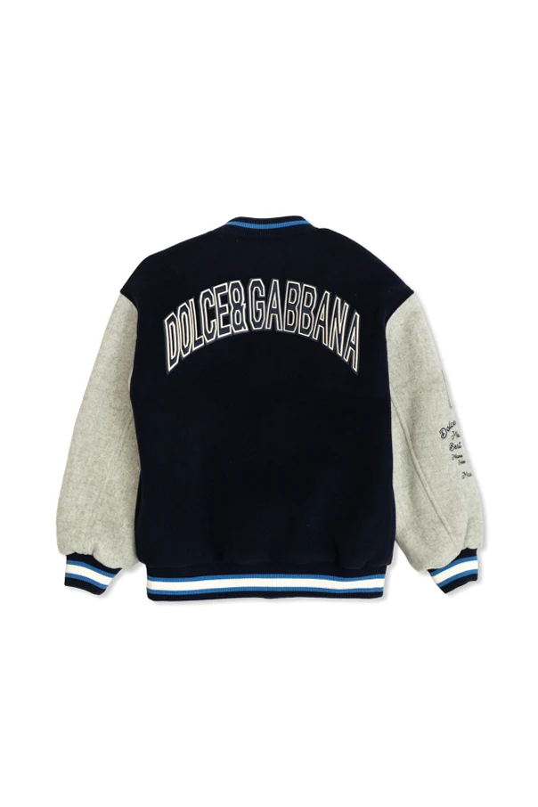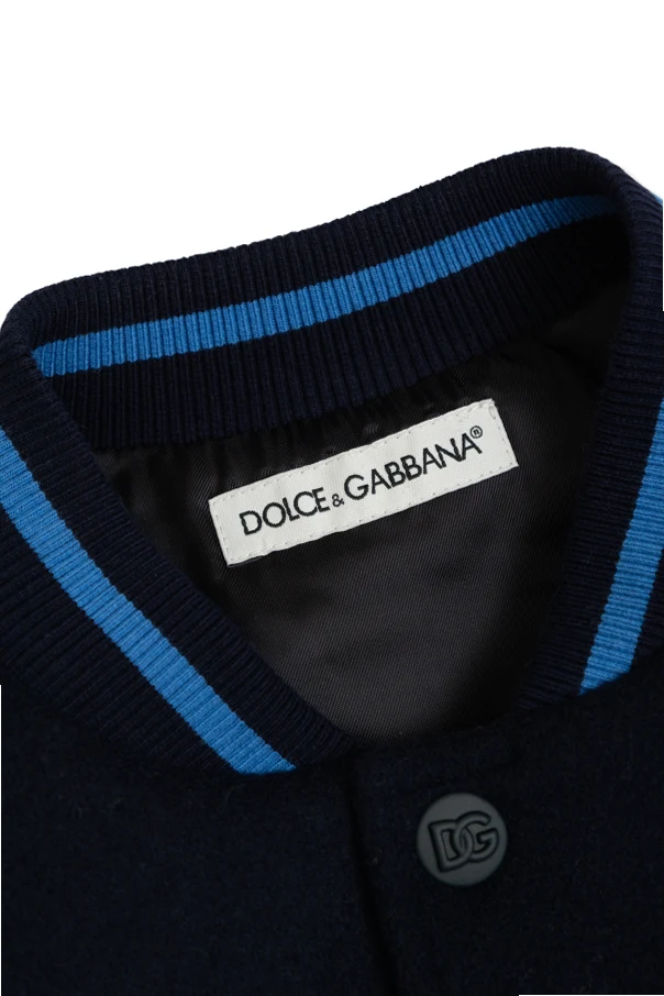 Kurtka typu bomber z kolekcji Dolce & Gabbana Kids stanowi esencję ponadczasowej elegancji inspirowanej estetyką varsity. Przemyślana kompozycja granatowego korpusu w połączeniu z kontrastującymi, jasnoszarymi rękawami, nadaje niezwykle wyrafinowany charakter.