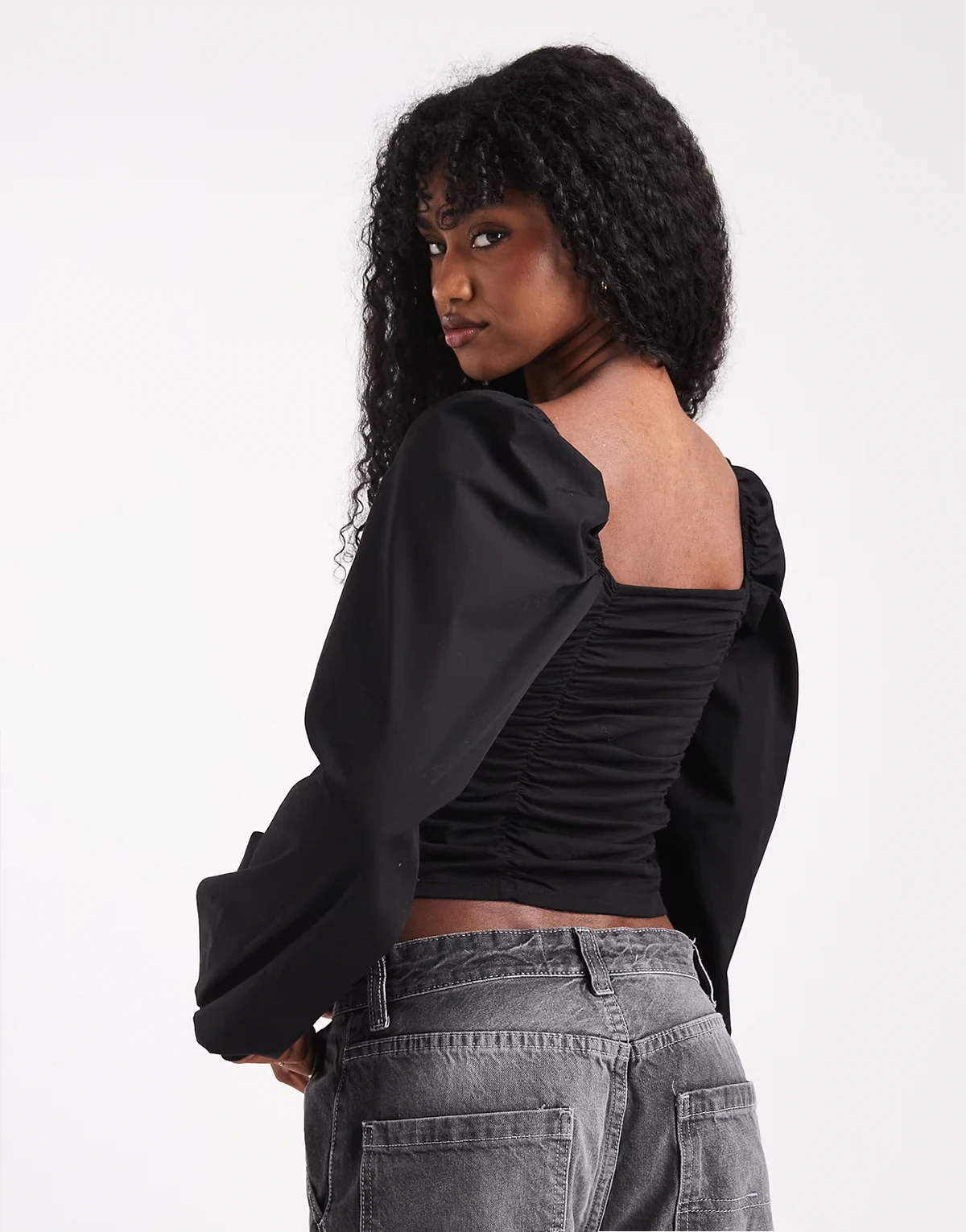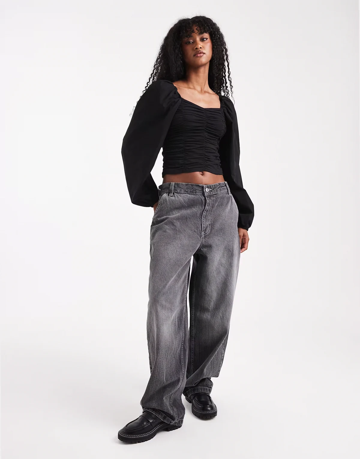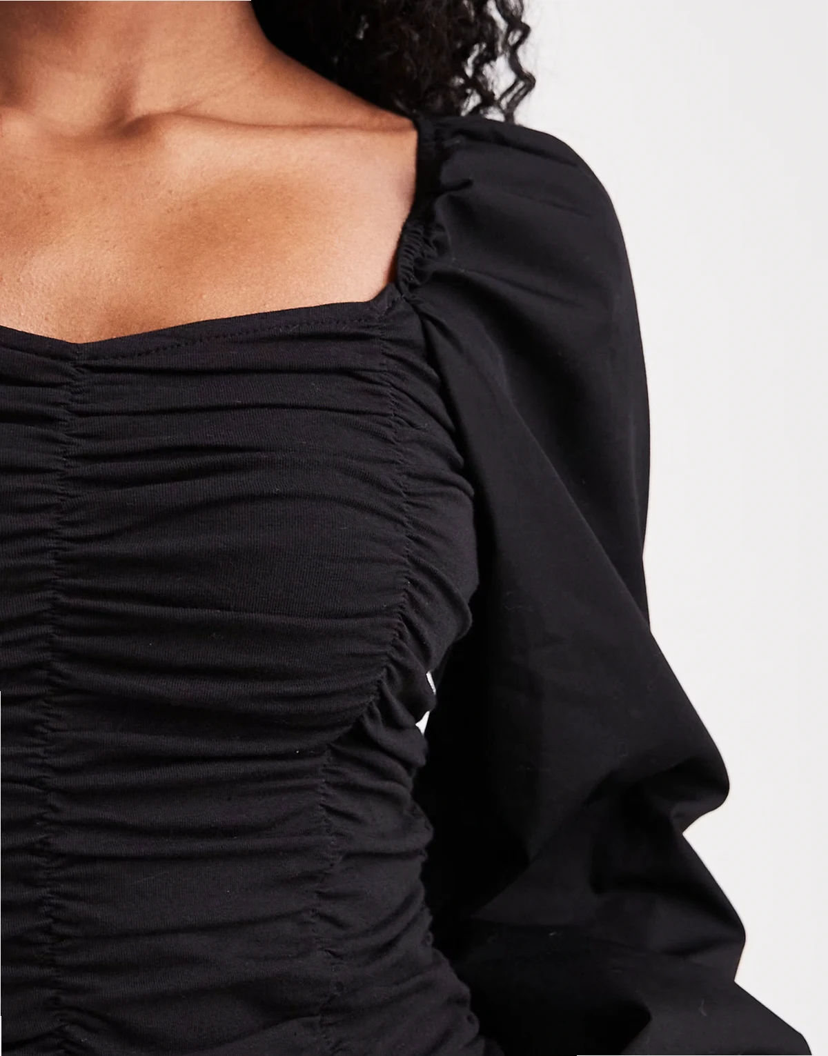 – Marszczona czarna bluzka z długimi rękawami
