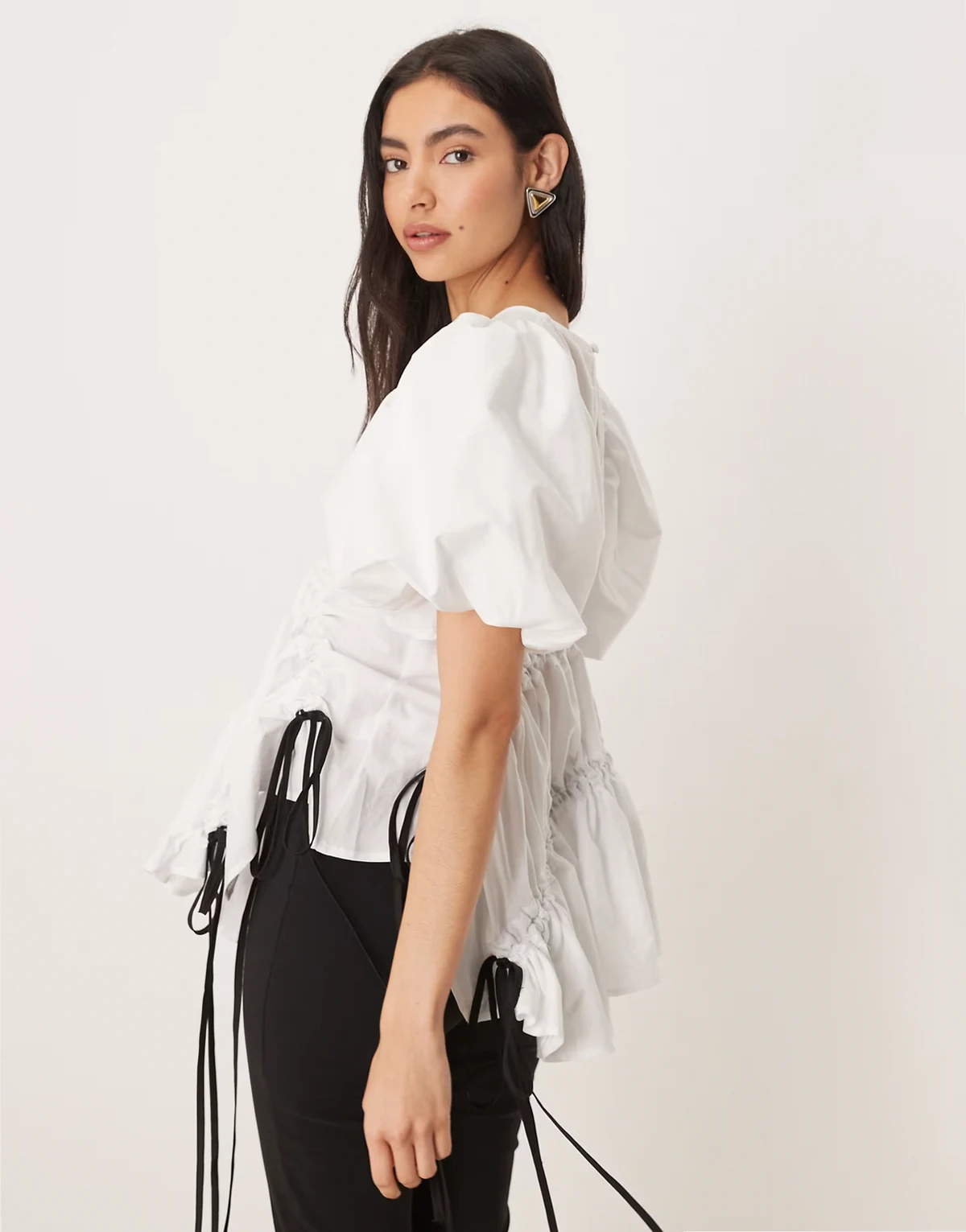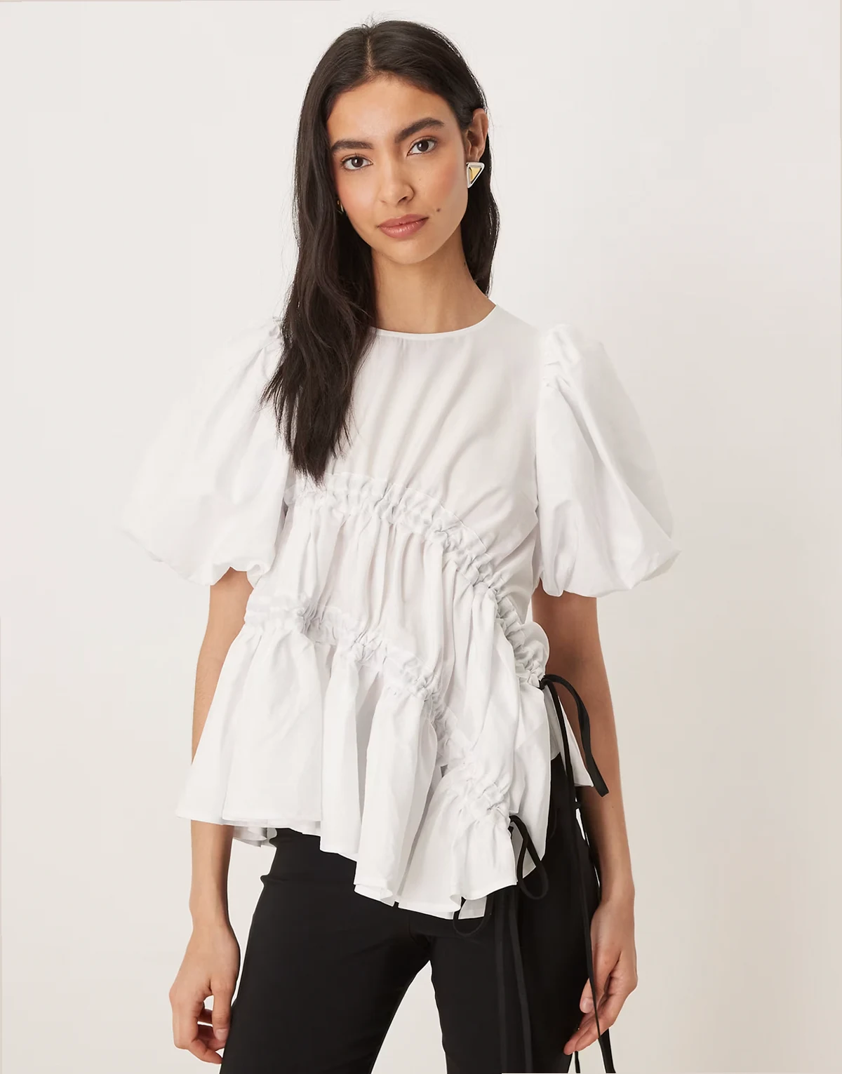 – Czarny marszczony top z bufkami i kołnierzykiem w groszki, część zestawu