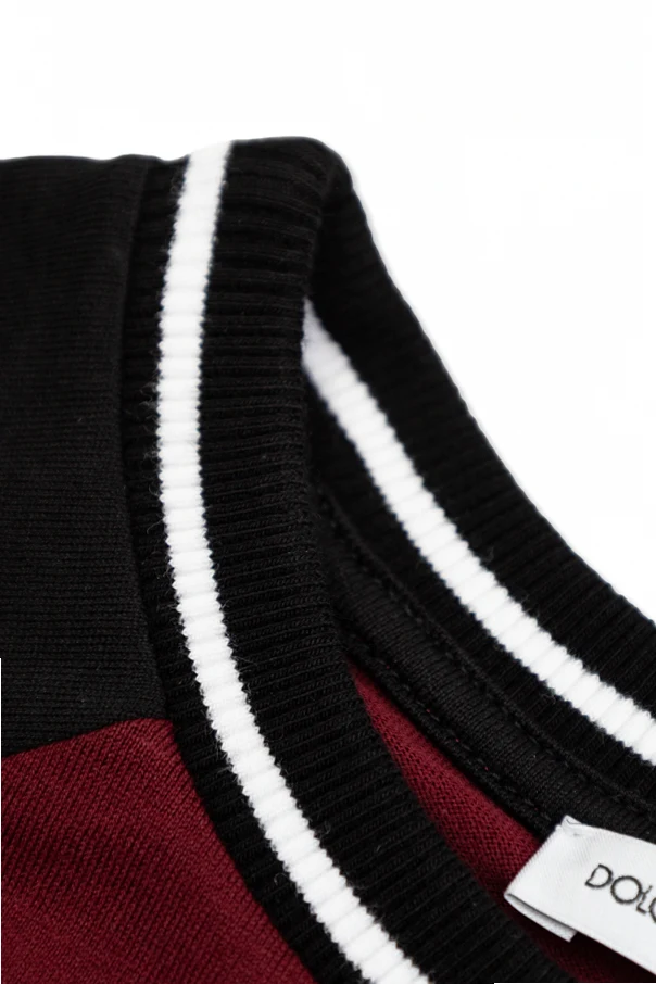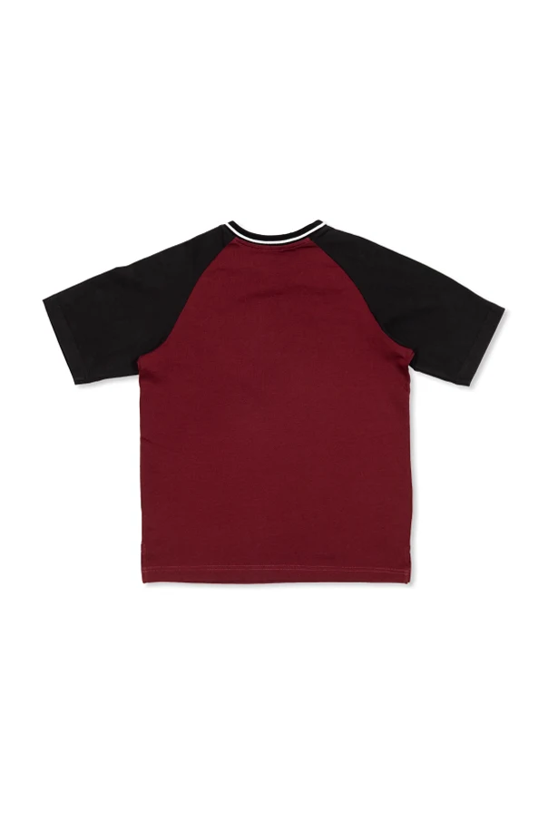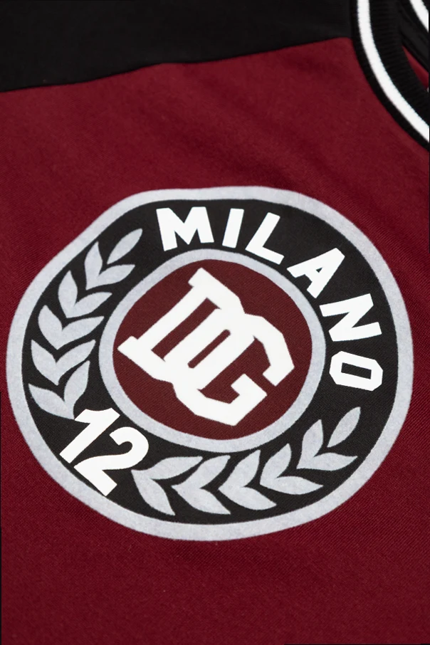 T-shirt dziecięcy marki Dolce & Gabbana Kids zachwyca ponadczasową formą oraz starannym wykonaniem. Klasyczny krój z krótkim rękawem raglan nabiera wyrazistości dzięki kontrastującym, czarnym rękawom oraz głębokiemu odcieniowi bordo , który emanuje elegancją i unikatowym charakterem. Przód koszulki zdobi efektowny, centralnie umieszczony nadruk – okrągłe logo z napisem „MILANO”, liczbą „12” i motywem wieńca, co nadaje produktowi sportowej dynamiki oraz szyku.