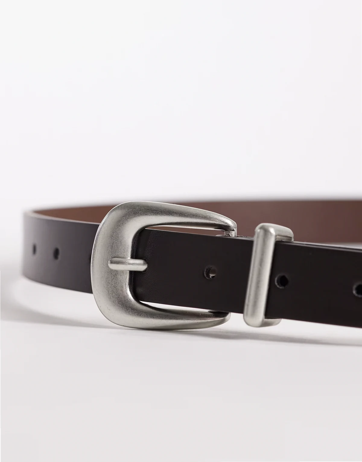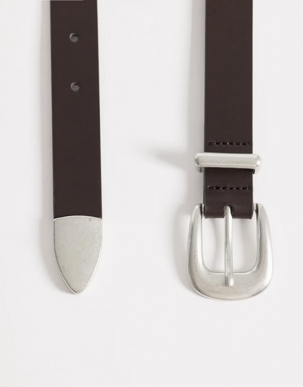 – Brązowy wąski pasek ze srebrną zaokrągloną klamrą i metalową końcówką