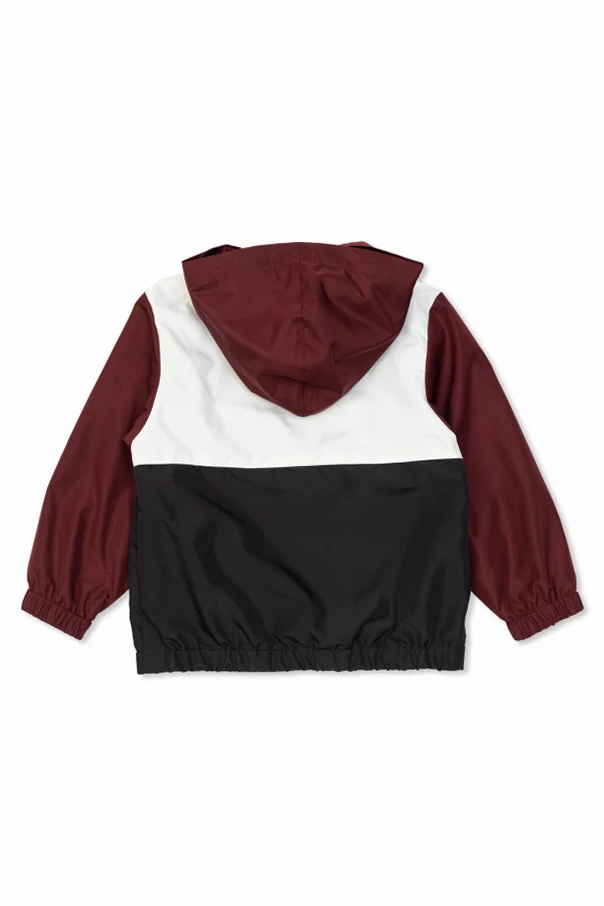 Kurtka z kapturem od renomowanego domu mody Dolce & Gabbana Kids, to kwintesencja elegancji w dziecięcym wydaniu. Zachwyca klasycznym, ponadczasowym fasonem z lekko luźnym krojem, który zapewnia komfort noszenia. Styl color block wyróżnia się harmonijnym połączeniem bordowego (rękawy i kaptur), białego (górna część) oraz czarnego (dolna część przodu i tyłu), nadając kurtce wyrazistego, wielobarwnego charakteru – multikolor dominuje w tej wyjątkowej kompozycji.