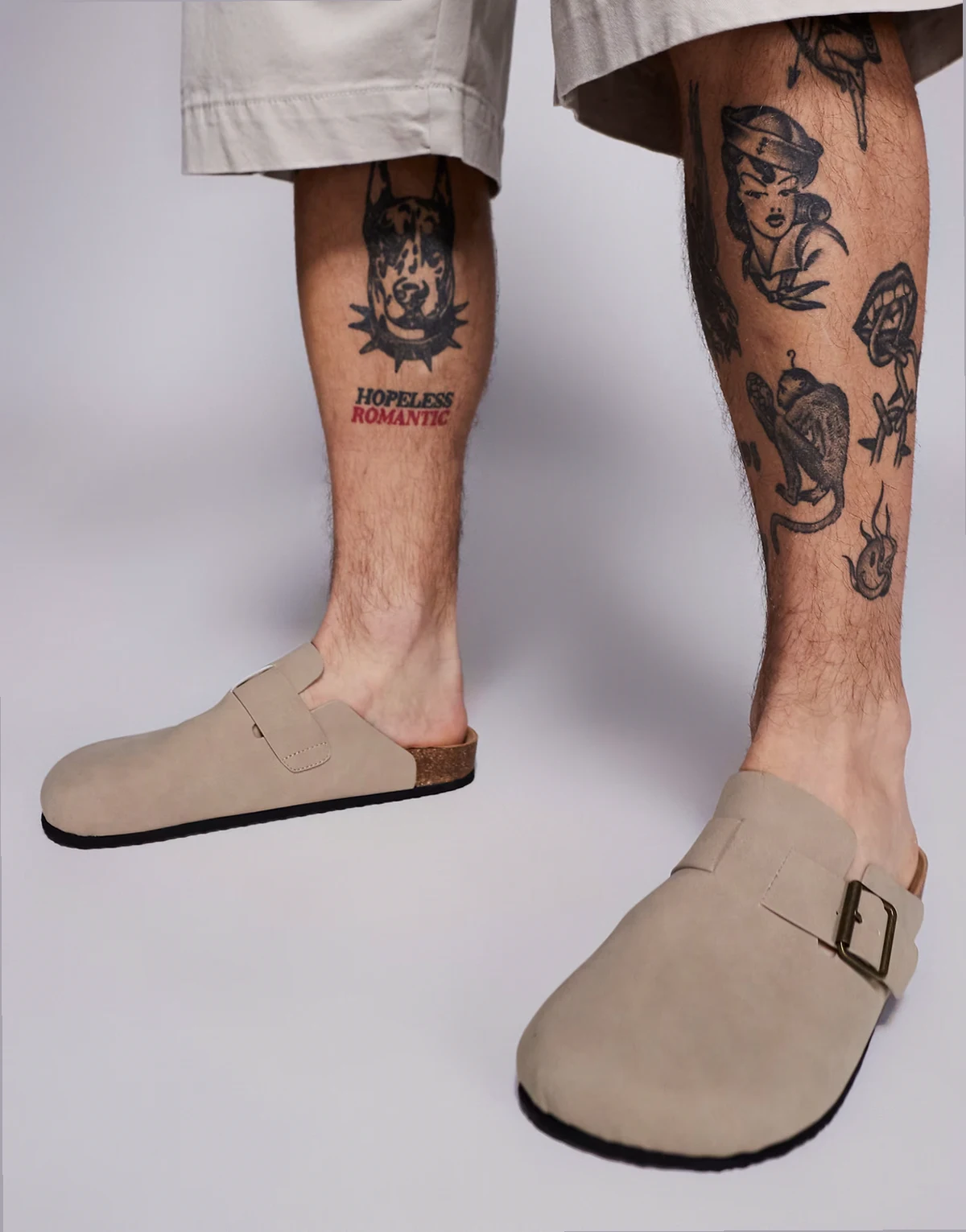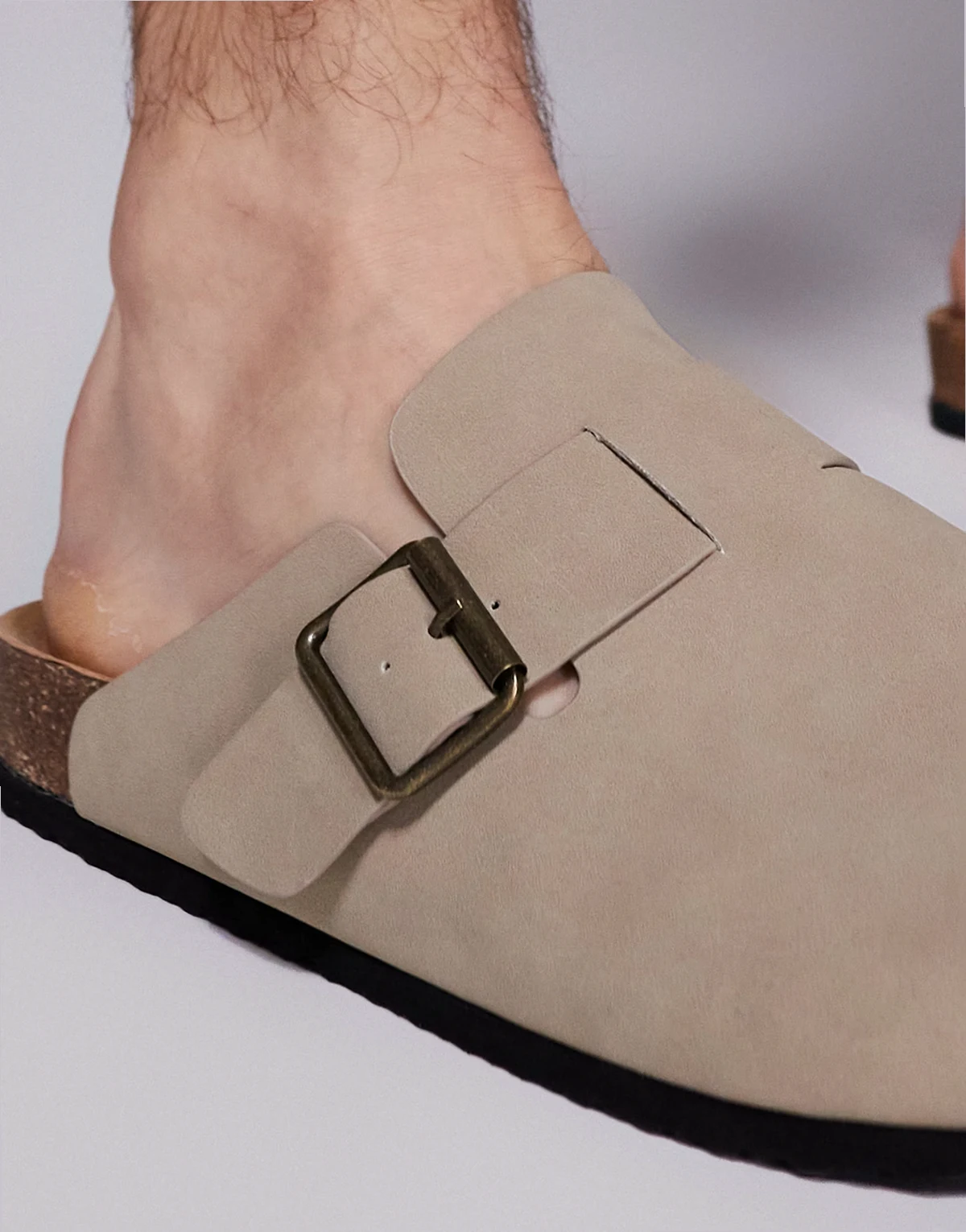 – Szarobeżowe sandały chodaki bez pięty z korkową podeszwą