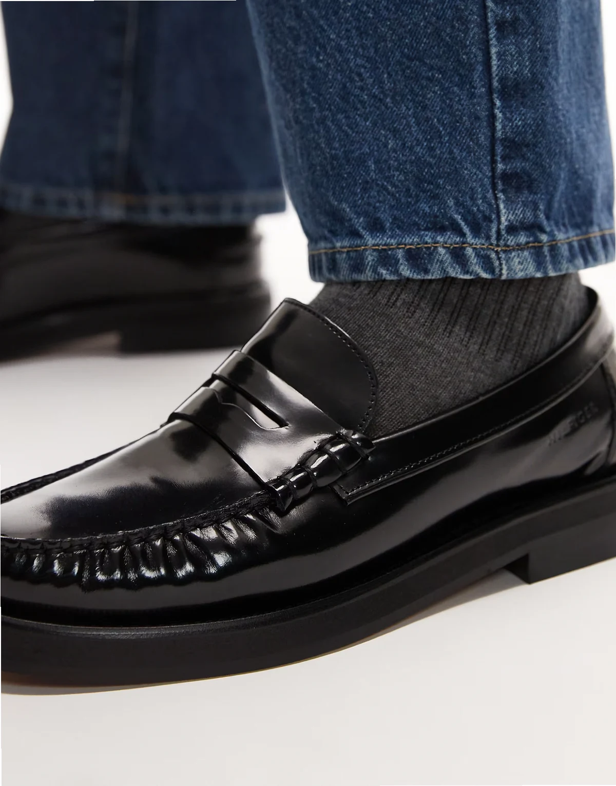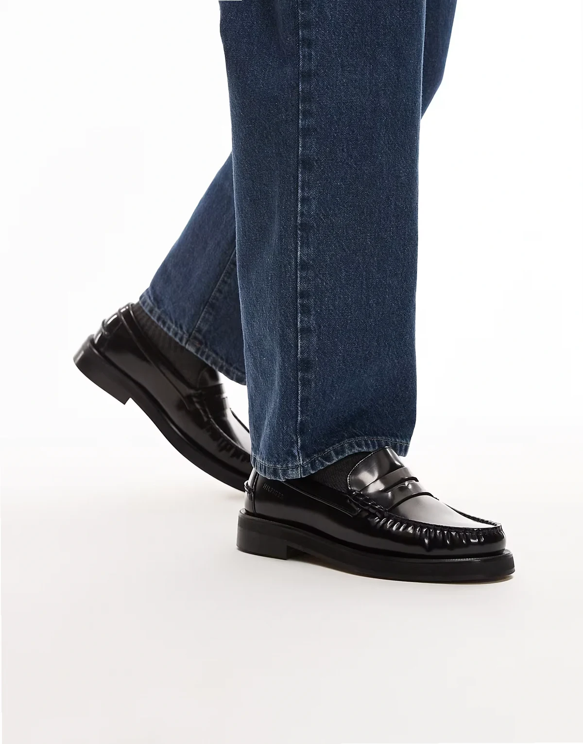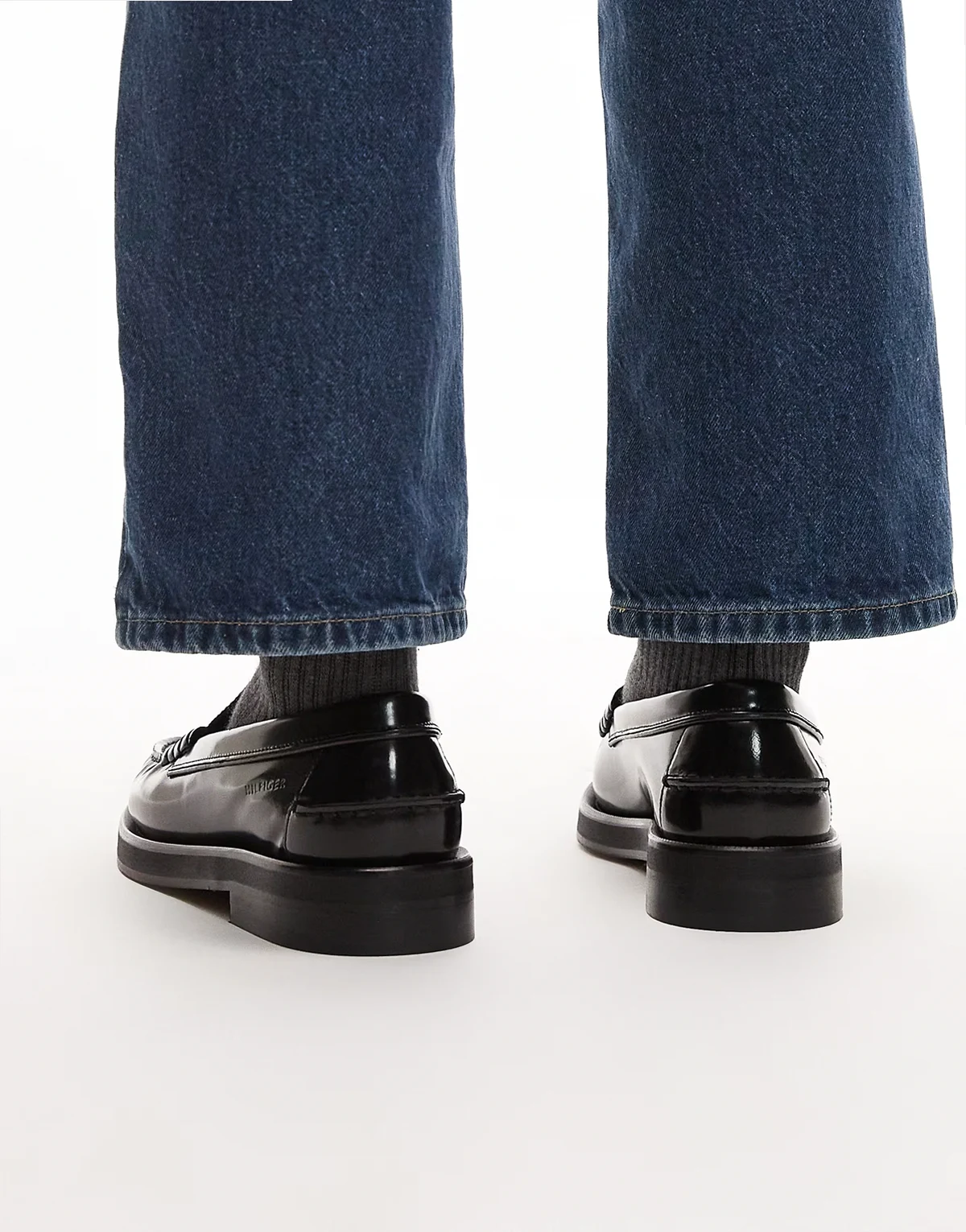 – Czarne loafersy z kwadratowymi noskami i frędzlami