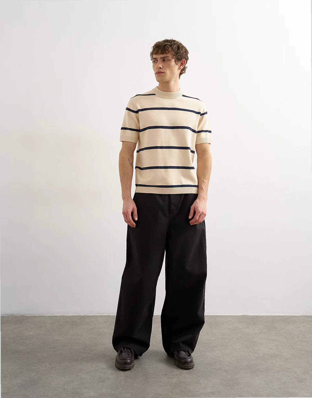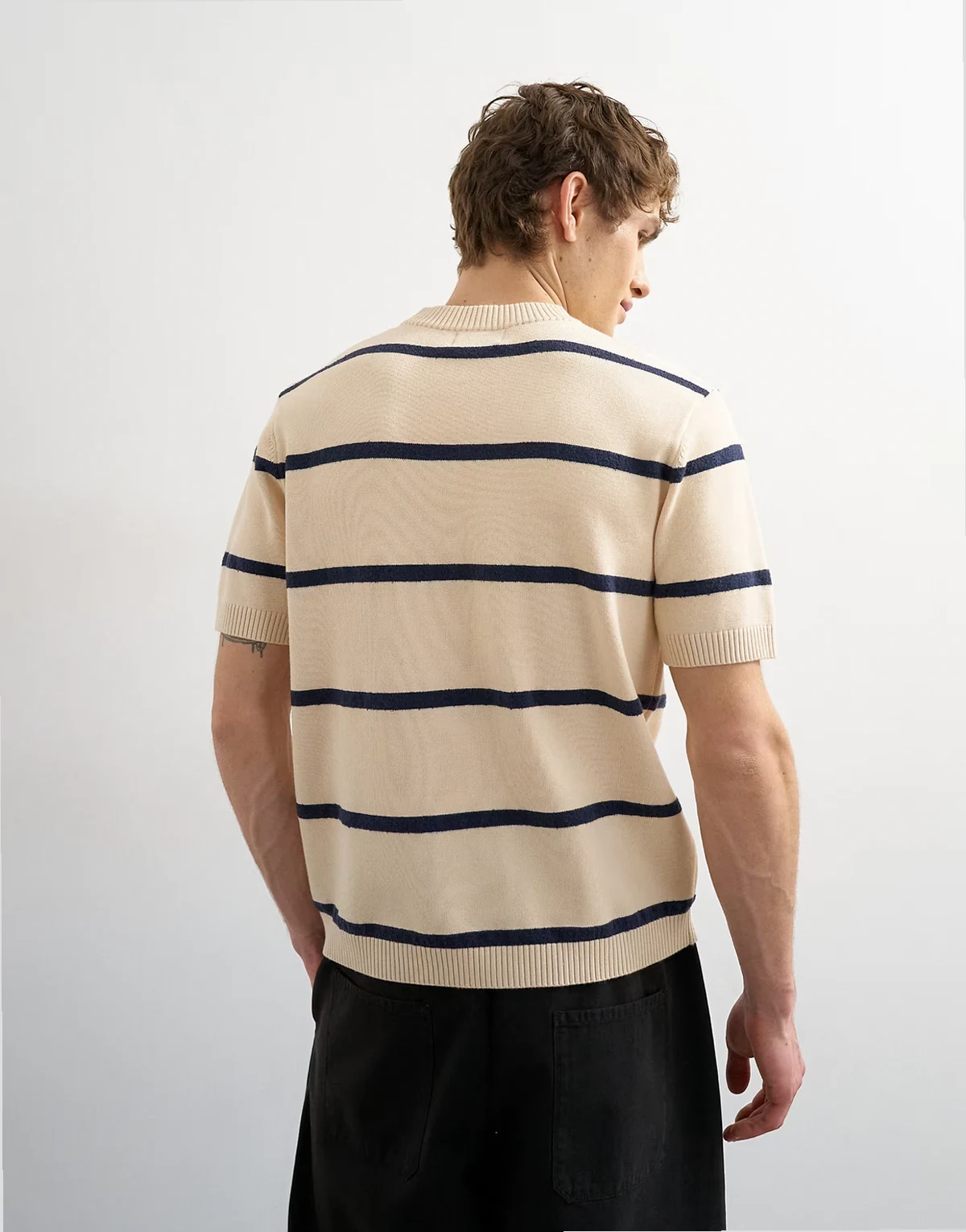 Ten top w paski na każdą porę roku ma okrągły dekolt i krótkie rękawy. Został uszyty z lekkiej i miękkiej dzianiny.