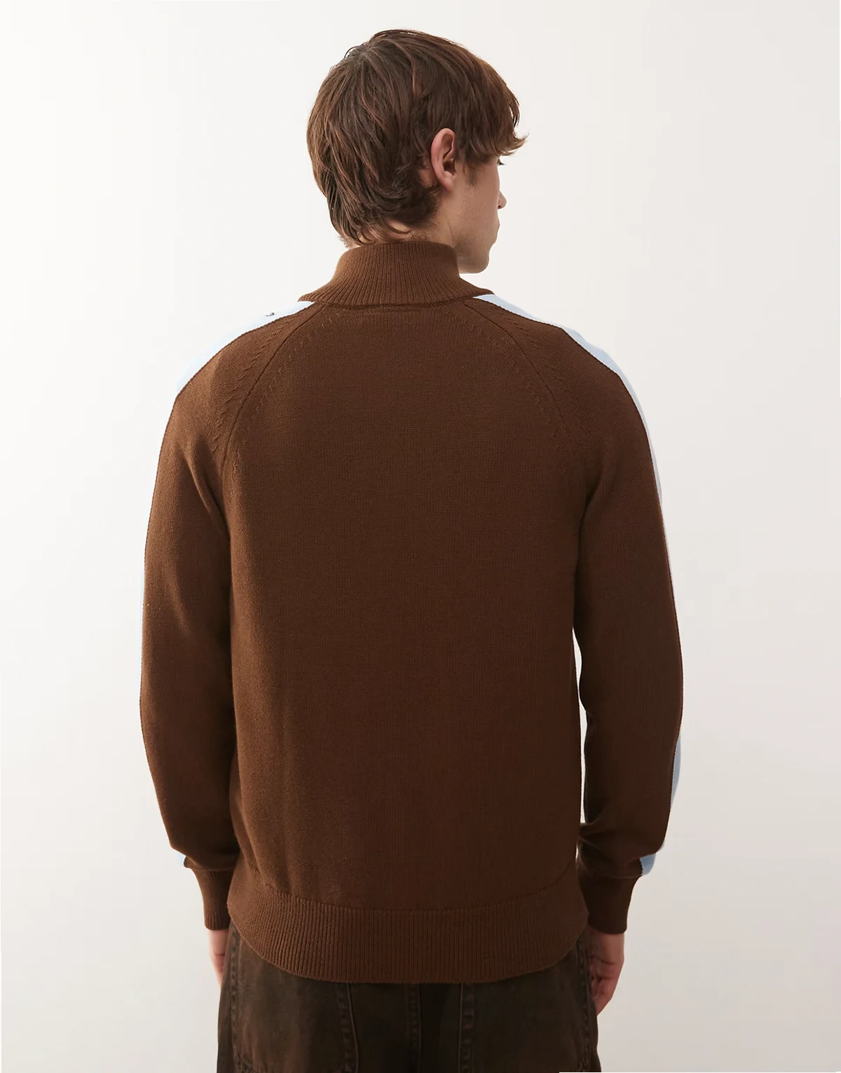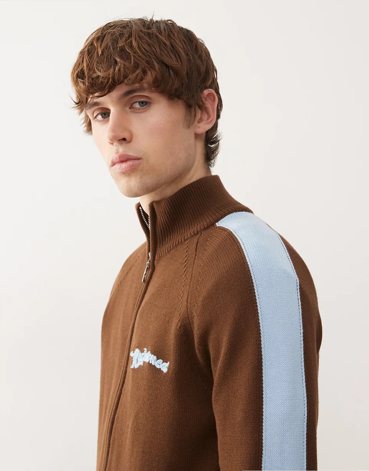 – Zapinana na zamek brązowa dzianinowa kurtka dresowa z kontrastowymi niebieskimi lampasami