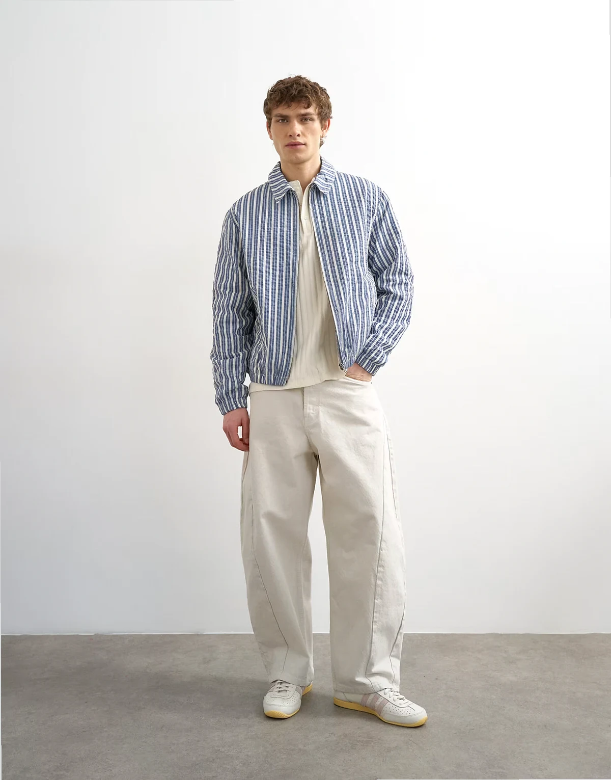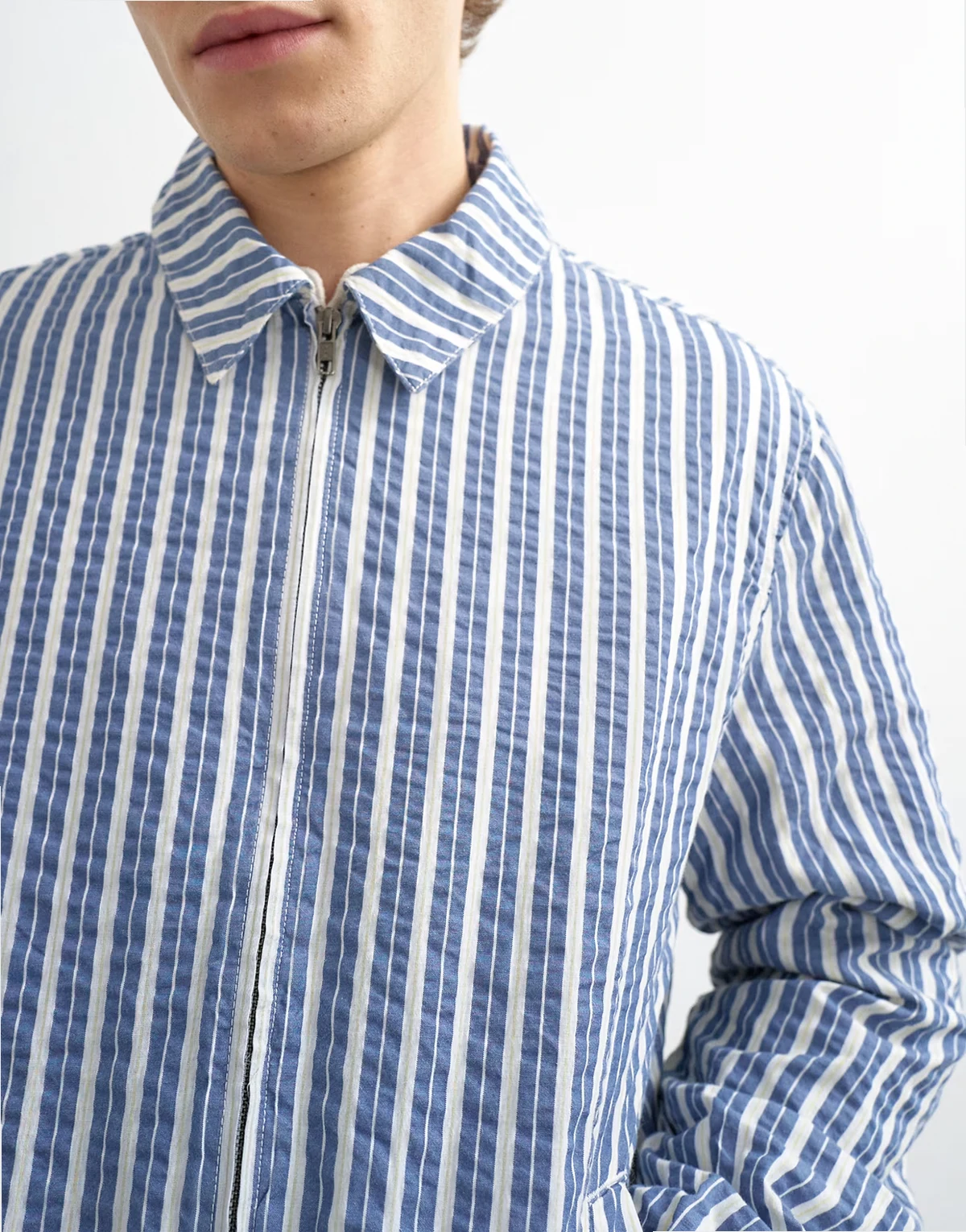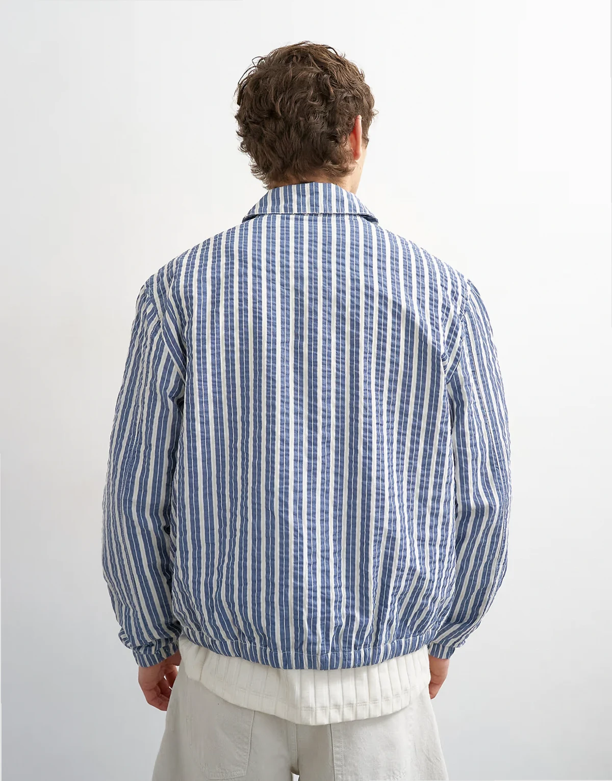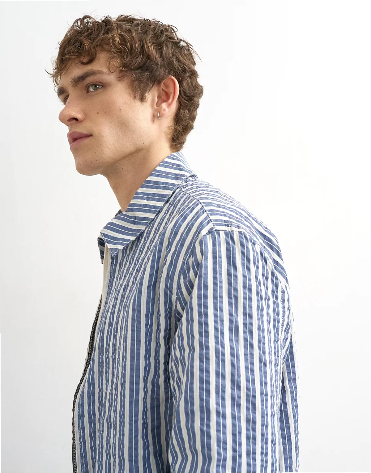 Ta kurtka została uszyta z lekko fakturowanego materiału w paski. Ma kołnierzyk włoski, zapięcie na zamek i boczne kieszenie. To model o regularnym, pudełkowym kroju z lekko elastycznym dołem.