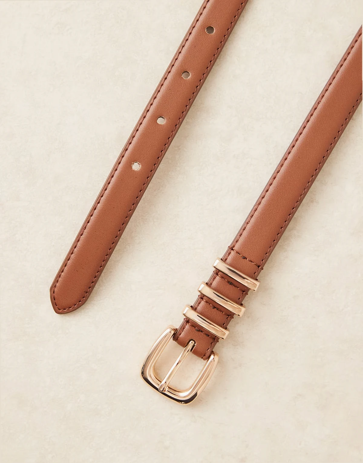 – Jasnobrązowy wąski pasek na talię i biodra z ozdobnymi szlufkami
