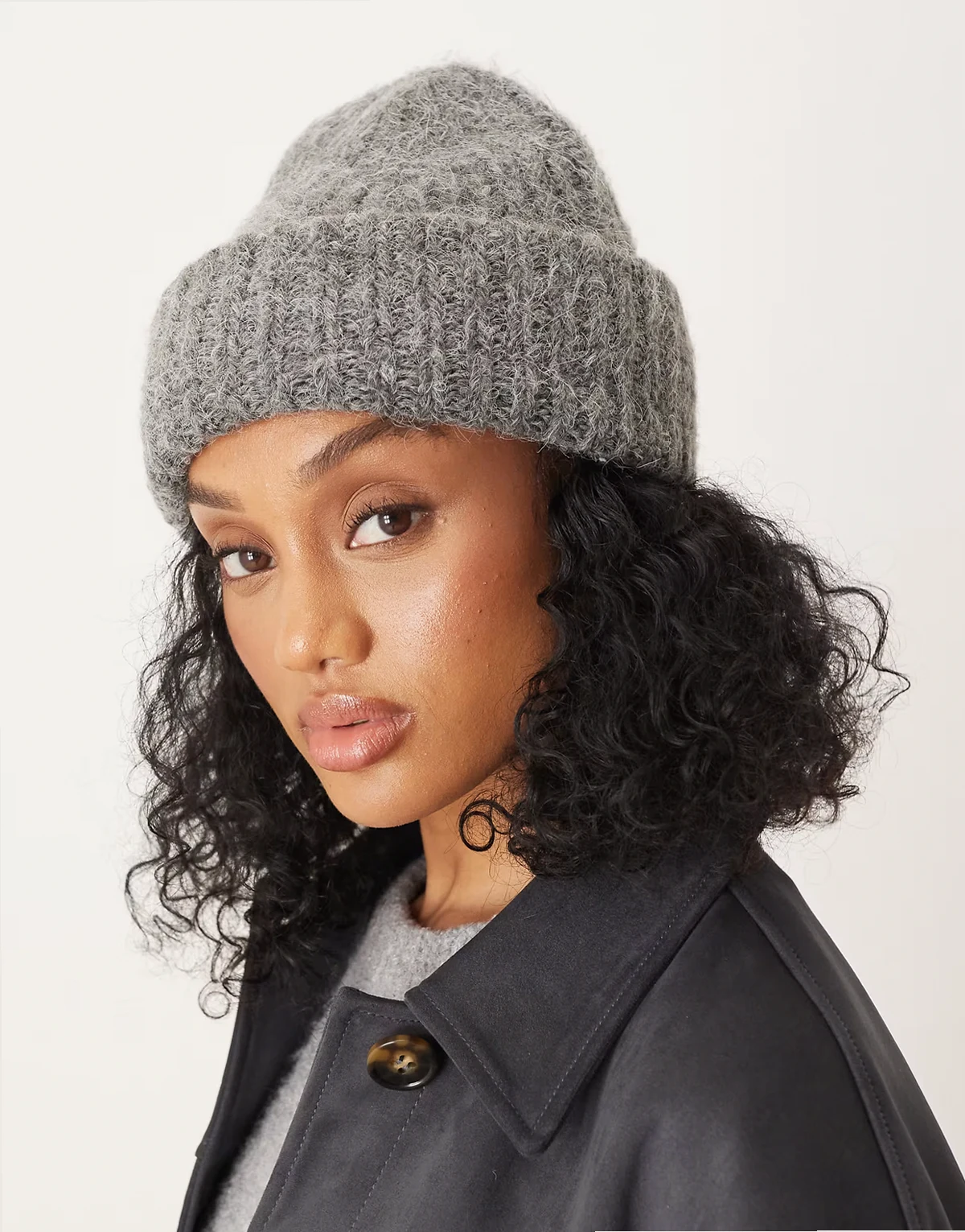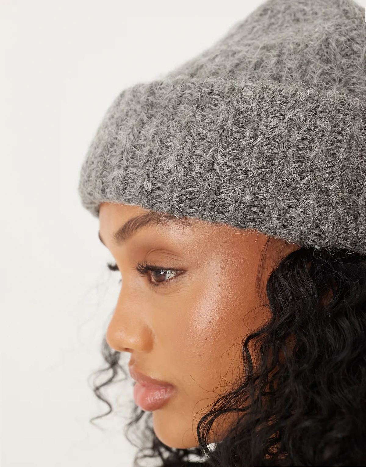 – Gruba czapka beanie z dzianiny z mieszanki wełny w kolorze szarym