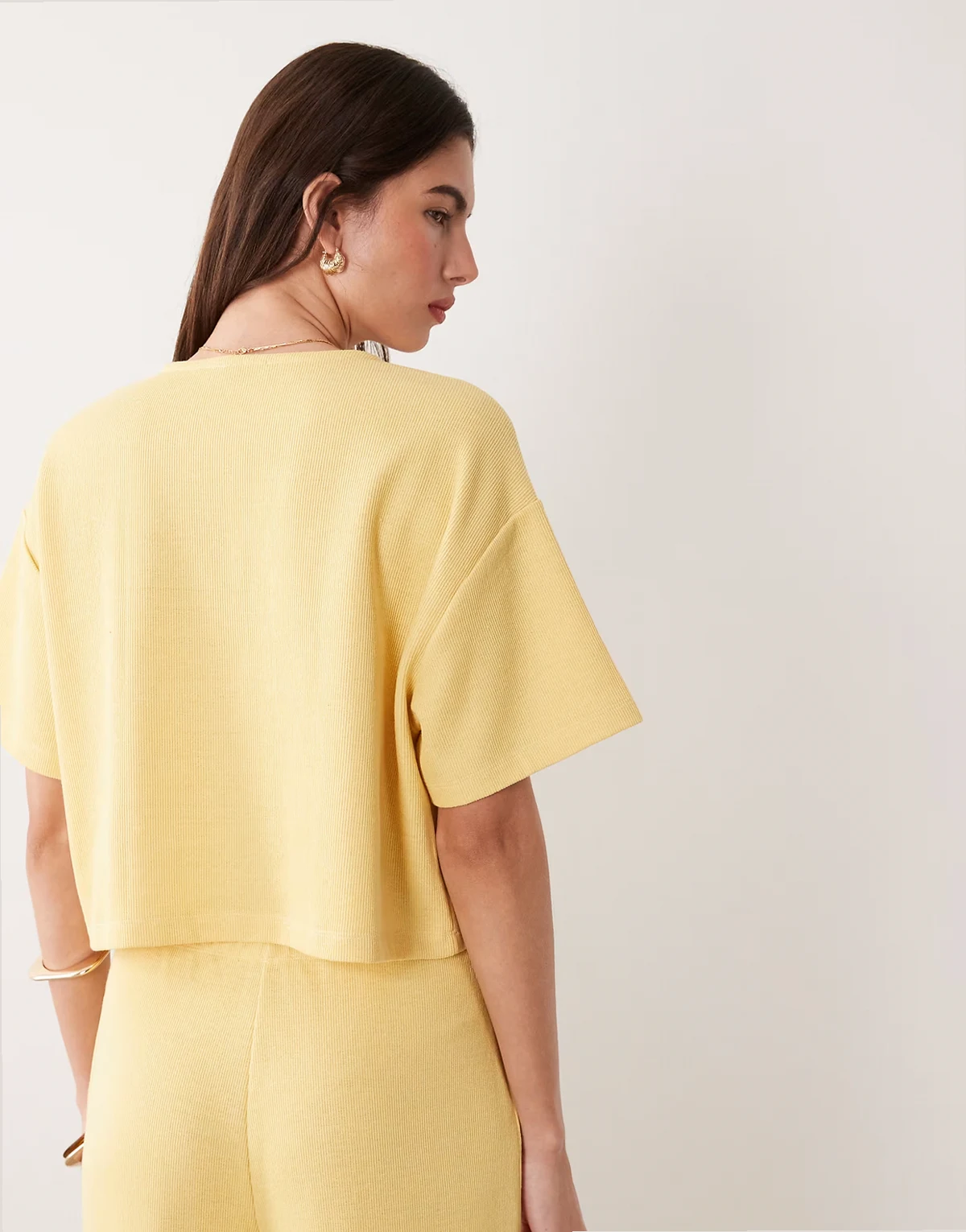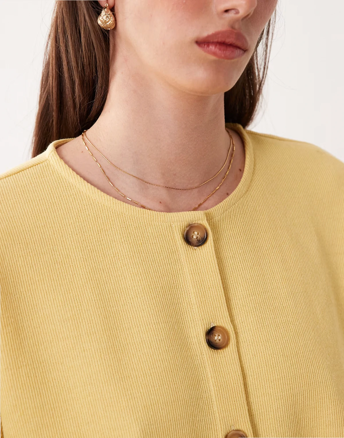 – Maślany delikatnie prążkowany kardigan z krótkimi rękawami, część zestawu