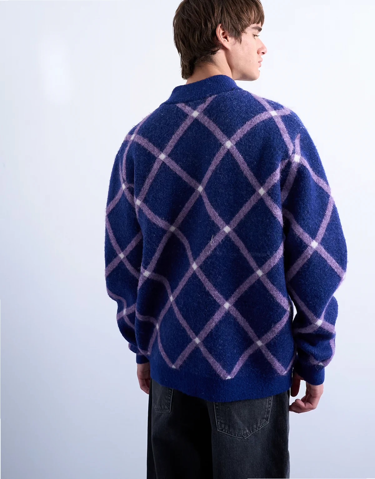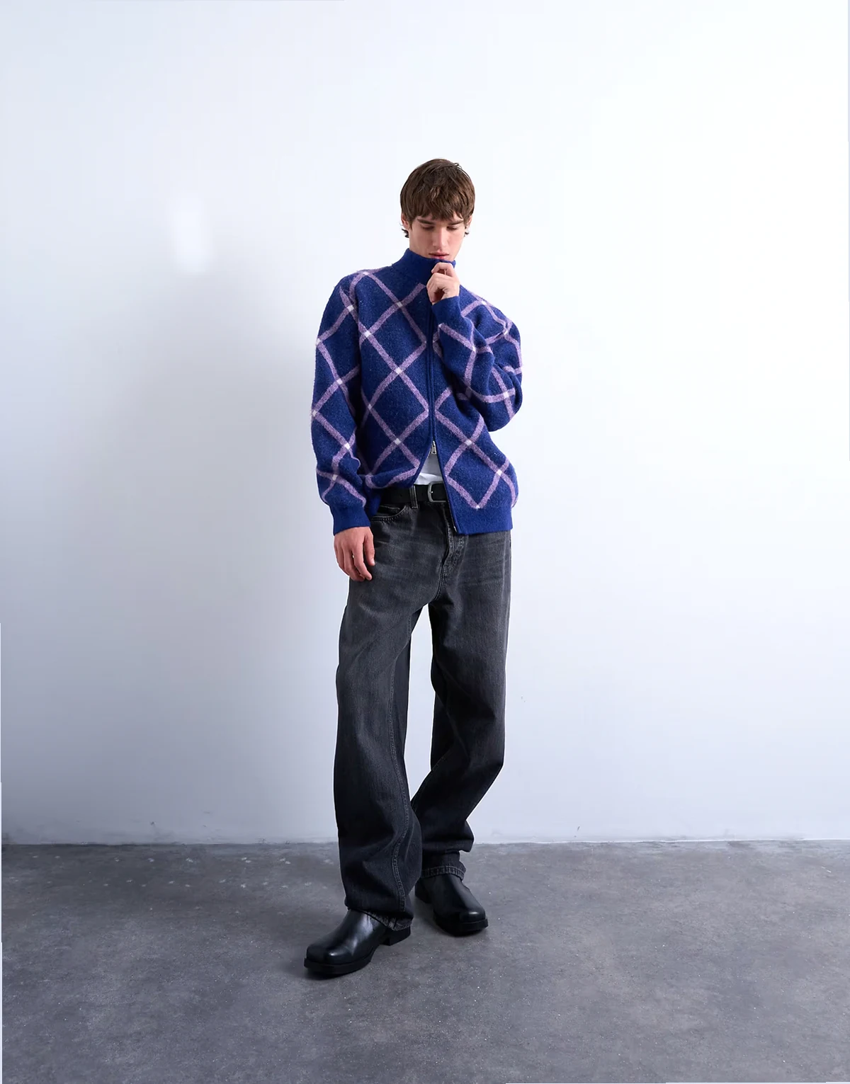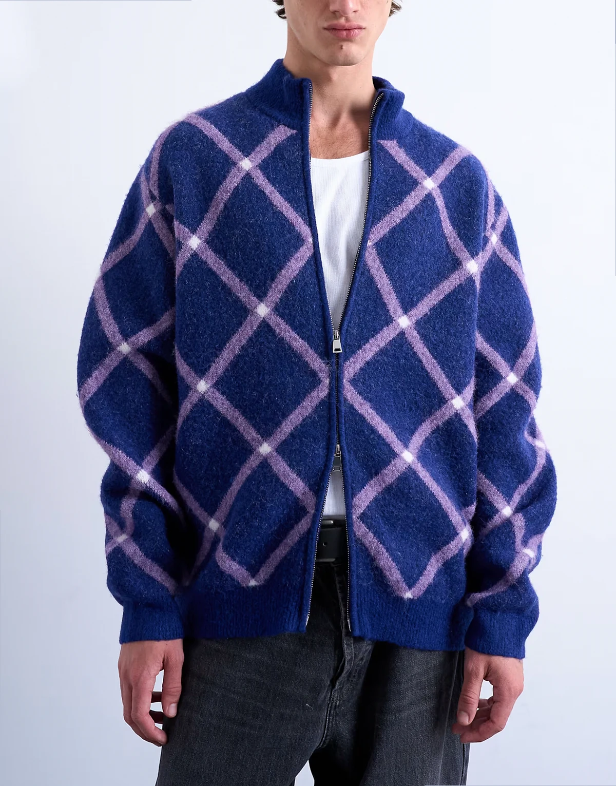 Ten sweter został uszyty z miękkiej dzianiny ze wzorem w romby. Ma golf i dwukierunkowy zamek. To model o regularnym kroju.