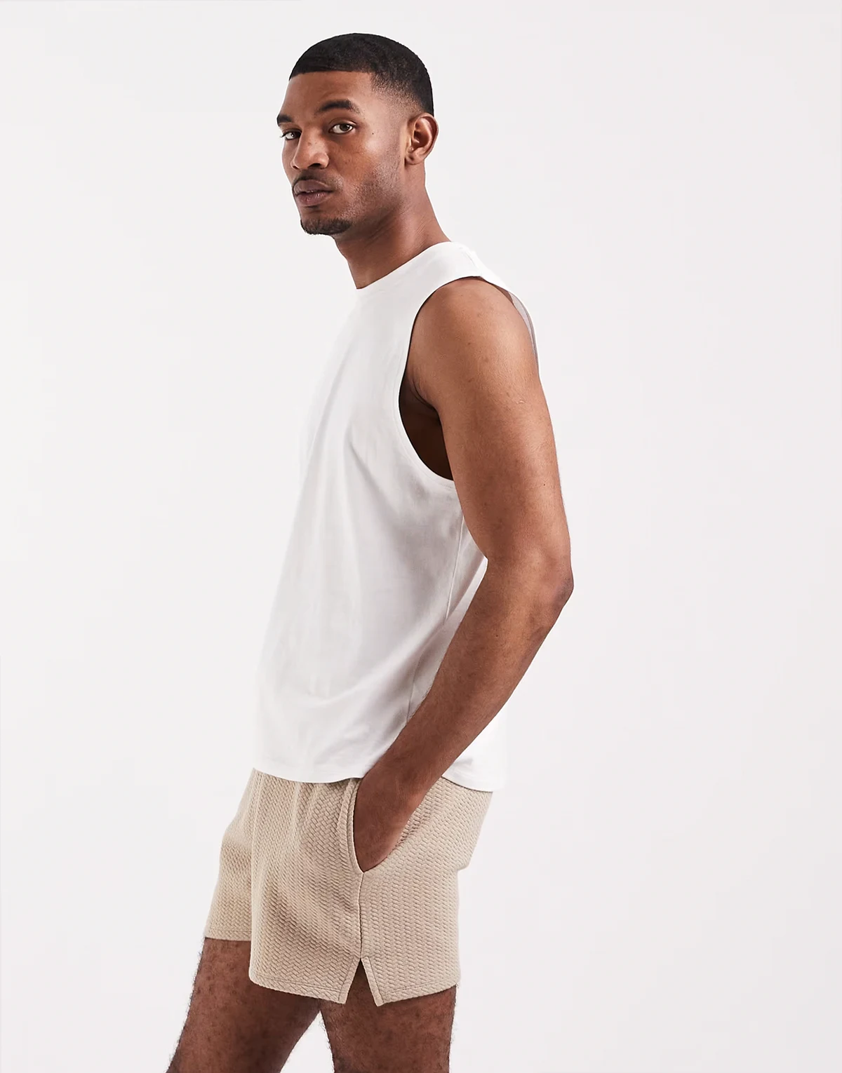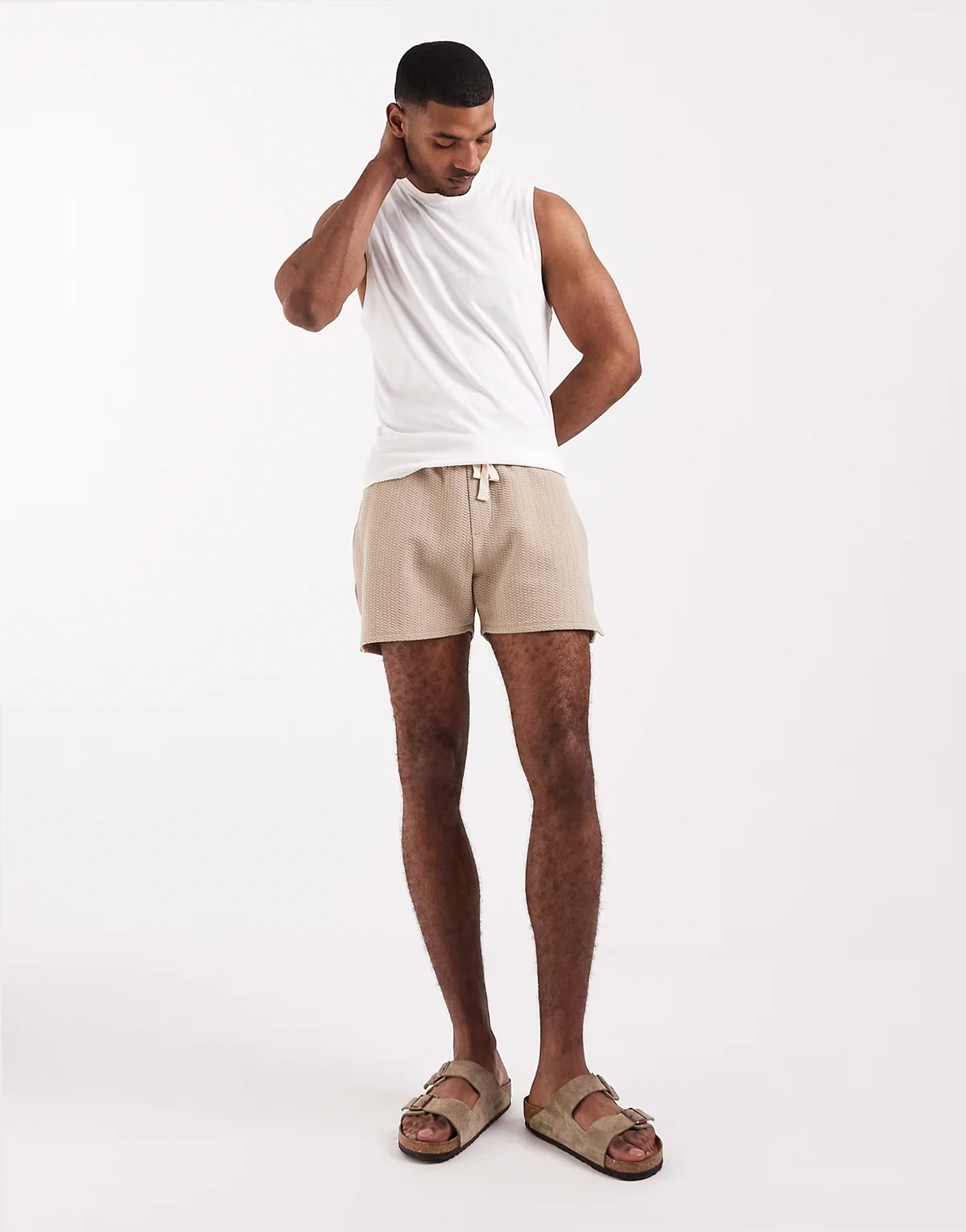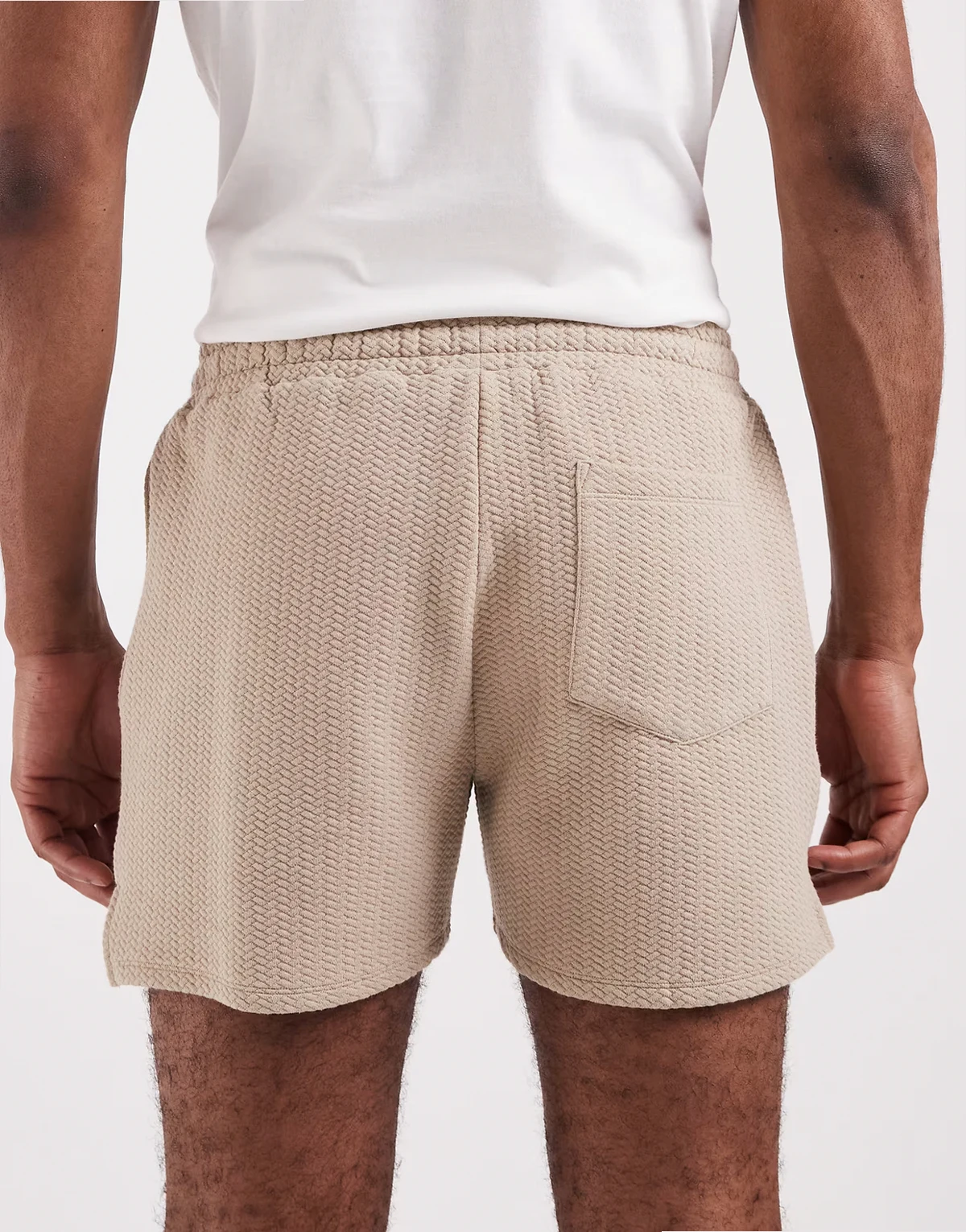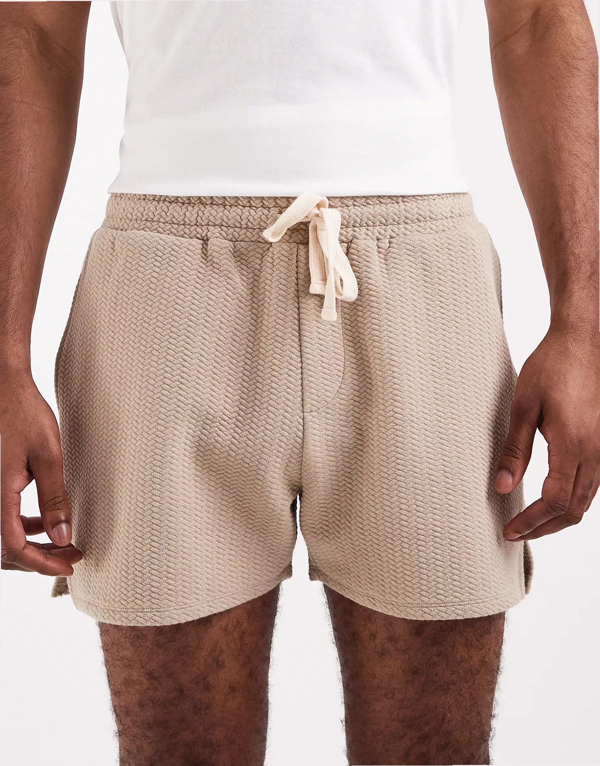 – Beżowe fakturowane szorty oversize w jodełkę