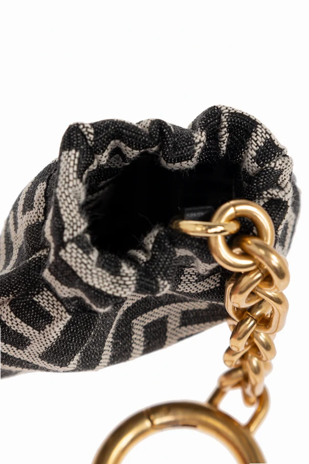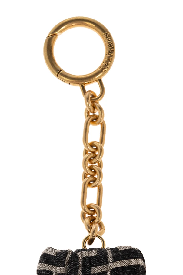 Brelok do kluczy z monogramem marki Balmain to wyrafinowany dodatek, który łączy najwyższy kunszt wzornictwa z wysublimowaną elegancją. Miniaturowa sakiewka o lekko zaokrąglonych bokach wykonana została z czarnej, tekstylnej tkaniny, ozdobionej powtarzalnym, geometrycznym monogramem w odcieniach szarości, tworząc wysmakowany motyw luksusowego domu mody.