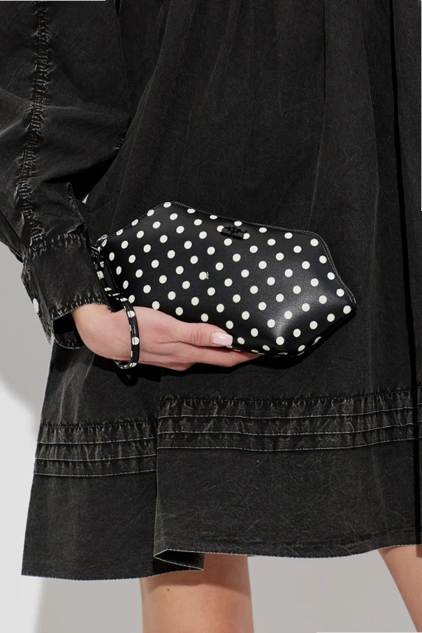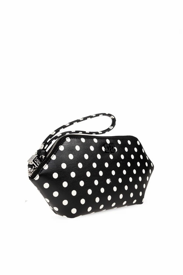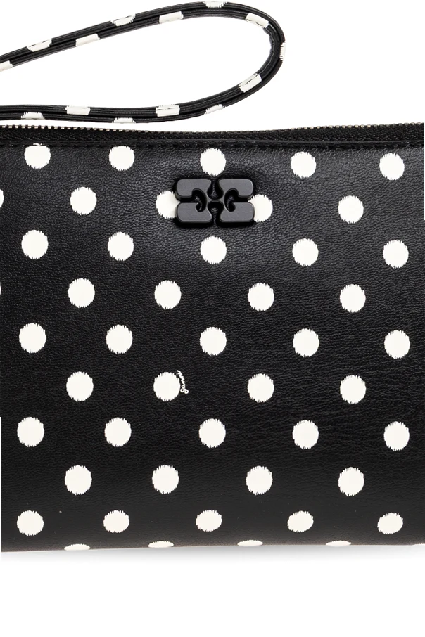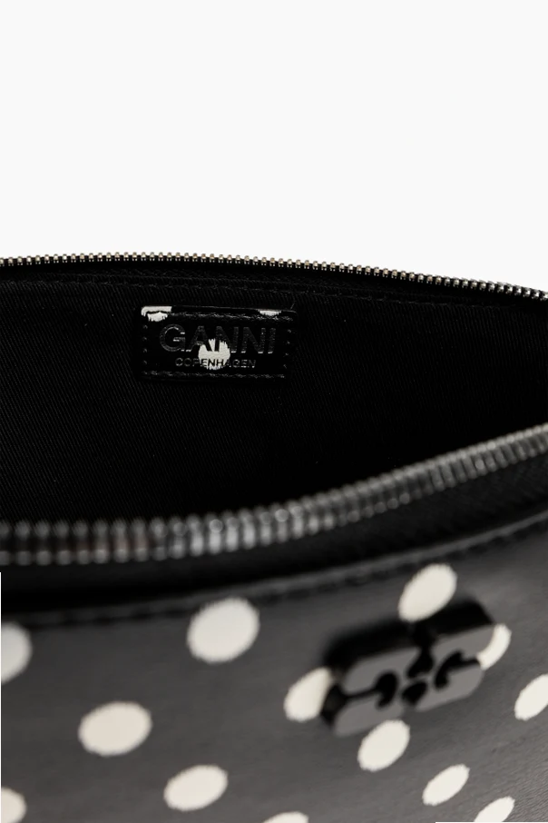 Czarna powierzchnia, ozdobiona regularnym wzorem białych grochów, przywodzi na myśl lekkość retro stylu, lecz zachowuje pełną świeżość współczesnego designu. Wykonanie z ekologicznej skóry świadczy o odpowiedzialności wobec środowiska, a detale w postaci tłoczonego, czarnego logo oraz wszywki z nazwą „GANNI” podkreślają autentyczność i wytworność produktu.