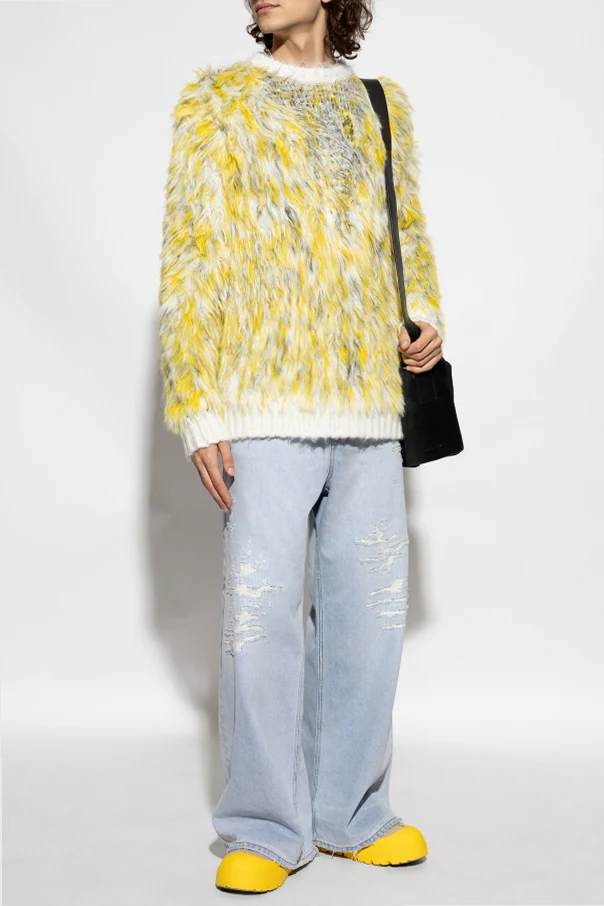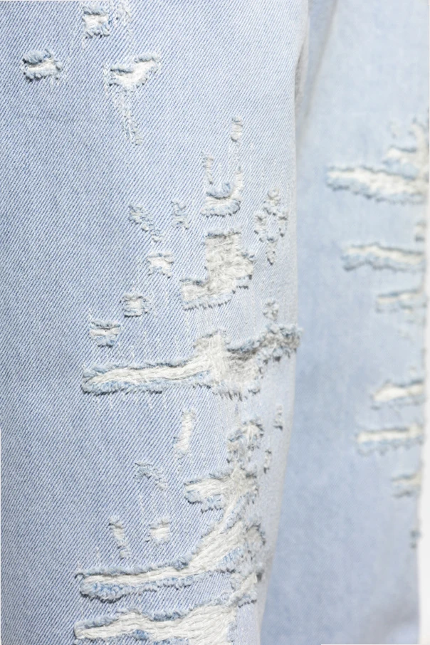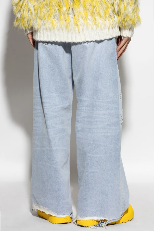 Jeansy 'D-RISE' typu 'wide leg' marki Diesel to wyraz bezkompromisowej elegancji, łączącej włoską tradycję z nowoczesnością. Szerokie, obszerne nogawki sięgające do ziemi oraz luźny, swobodny fason zapewniają niepowtarzalną sylwetkę, pełną komfortu i wyrafinowania. Klasyczny, sztywny denim z celowo postarzanymi przetarciami i surowymi, postrzępionymi krawędziami emanuje awangardowym sznytem, a brak elastyczności podkreśla solidność oraz autentyczność materiału bawełnianego.