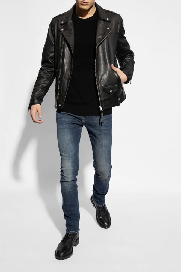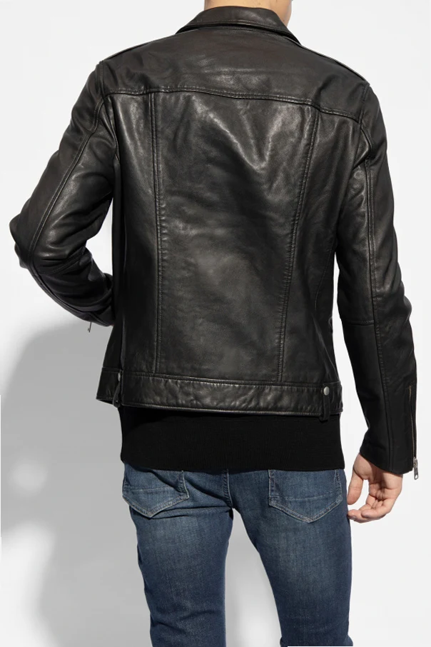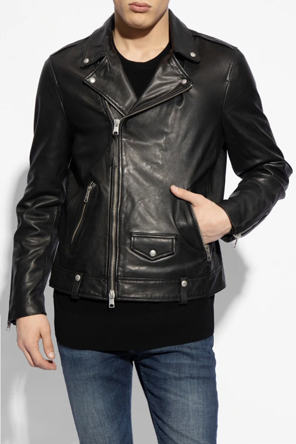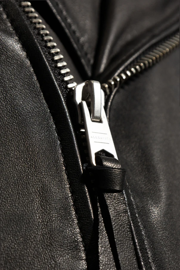 Czarna kurtka typu 'biker' z pagonami, model 'Milo' AllSaints. Wykonana ze skóry jagnięcej. Zapinana na dwubiegunowy zamek i zatrzaski. Z przodu trzy kieszenie – dwie zamykane na zamki, jedna z patką zapinana na zatrzask. Długie rękawy z wszytymi zamkami. Metalowe elementy w kolorze postarzanego srebra.