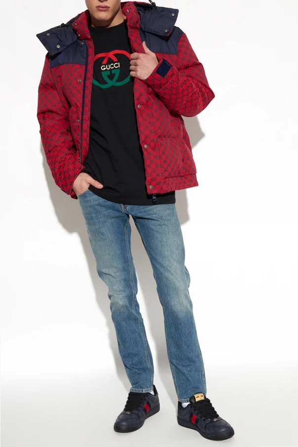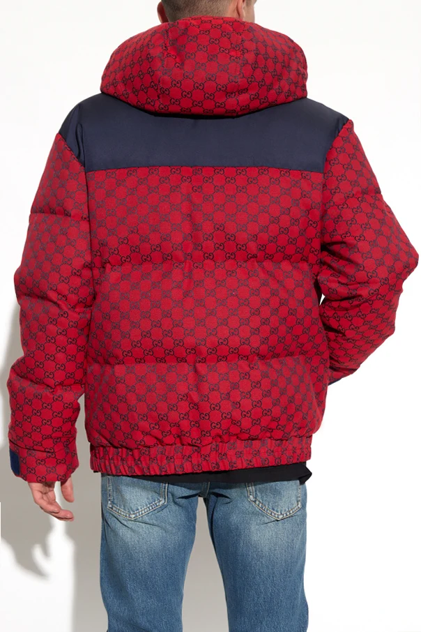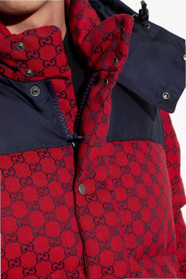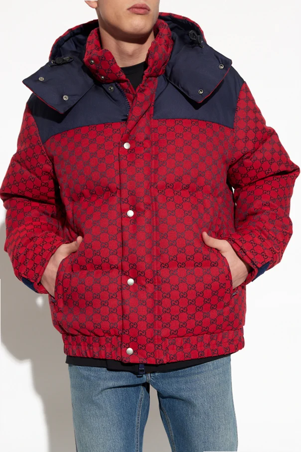 Czerwono-granatowa kurtka puchowa Gucci. Zapinana na dwubiegunowy zamek oraz zatrzaski. Ozdobiona wzorem z monogramem GG. Odpinany kaptur. Dwie kieszenie z zapięciem na zamek. Dół i długie rękawy wykończone ściągaczem.