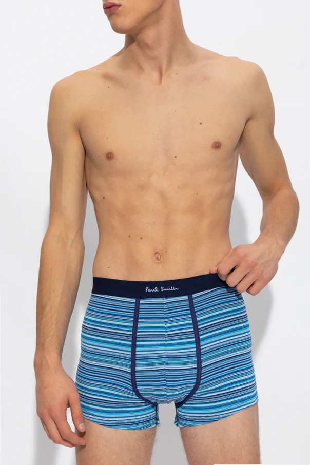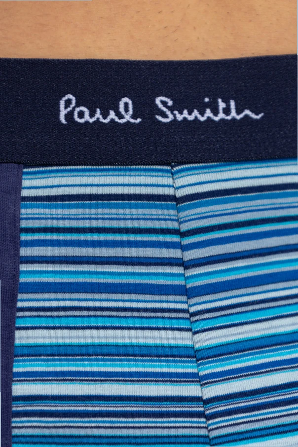 Trójpak niebiesko-granatowych bokserek Paul Smith. Wykonane z bawełny organicznej. W pasie wszyta guma z logo. Ozdobione wzorem w paski.