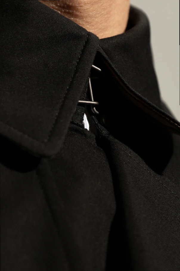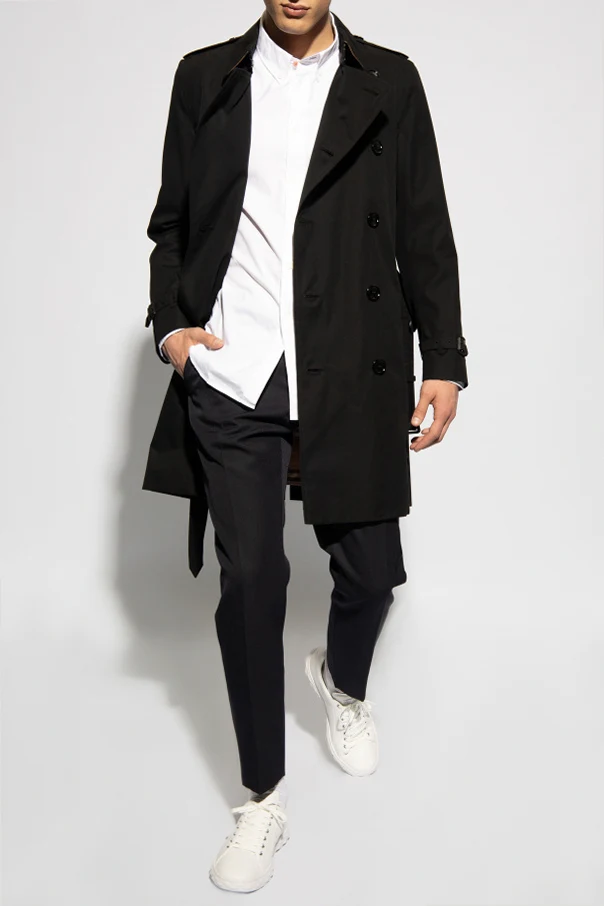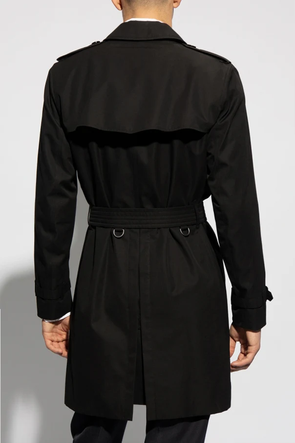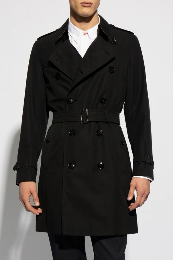 Czarny trencz Burberry. Wykonany z bawełny. Dwurzędowe zapięcie na guziki oraz pas z klamrą. Na ramionach pagony. Dwie kieszenie wsuwane. Długie rękawy.