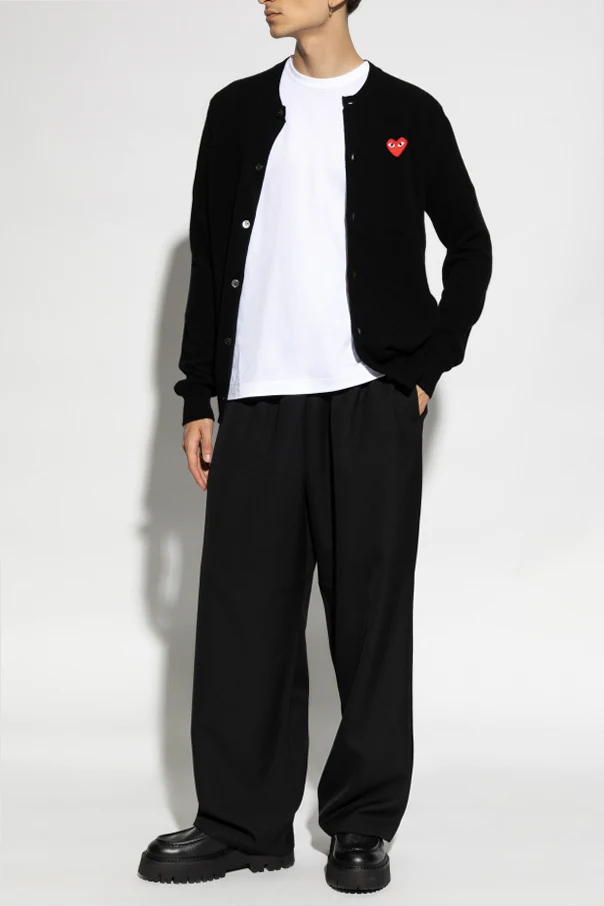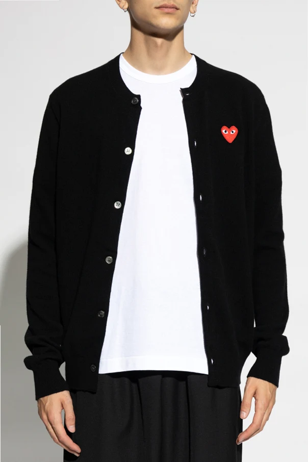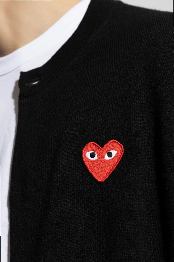 Charakterystyczną cechą tego kardiganu jest umieszczona na lewej piersi naszywka w kształcie czerwonego serca z białymi oczami - znak rozpoznawczy marki, który dodaje produktowi unikatowości. Kontrastujące białe guziki na czarnym tle nadają całości elegancki, a zarazem nowoczesny wygląd.