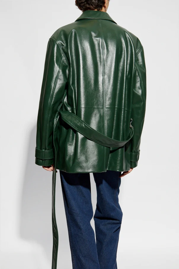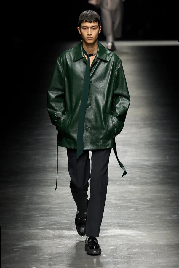 Kurtka posiada klasyczny, prosty krój z długimi rękawami i tradycyjnym kołnierzem. Wykonana z błyszczącej skóry, nadaje jej ekskluzywny wygląd i zapewnia trwałość oraz komfort noszenia. Intensywna zieleń wyróżnia się na tle standardowych kolorów, przyciągając uwagę i dodając charakteru.