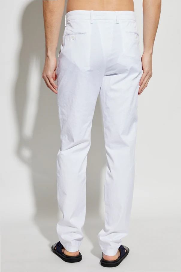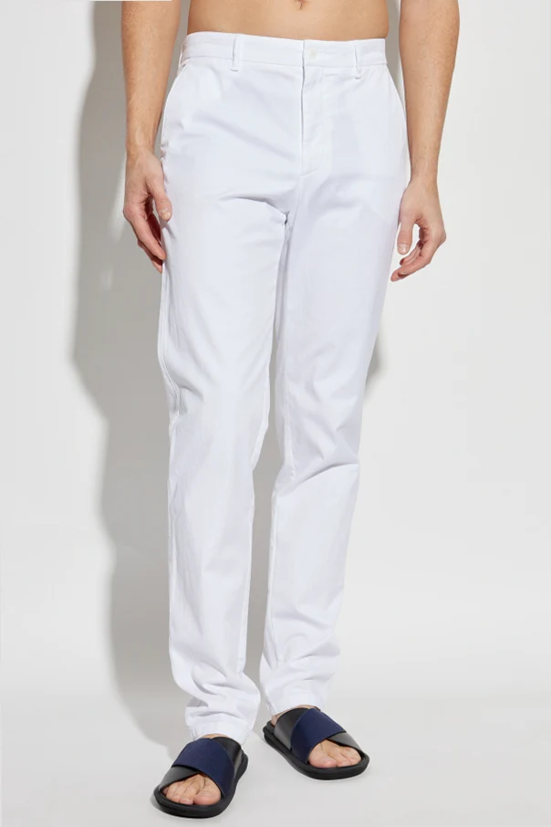 Przedstawiamy Spodnie z lekko zwężanymi nogawkami z ekskluzywnej kolekcji marki Giorgio Armani. Te eleganckie męskie spodnie w dominującym białym kolorze zachwycają świeżością i szlachetnością.