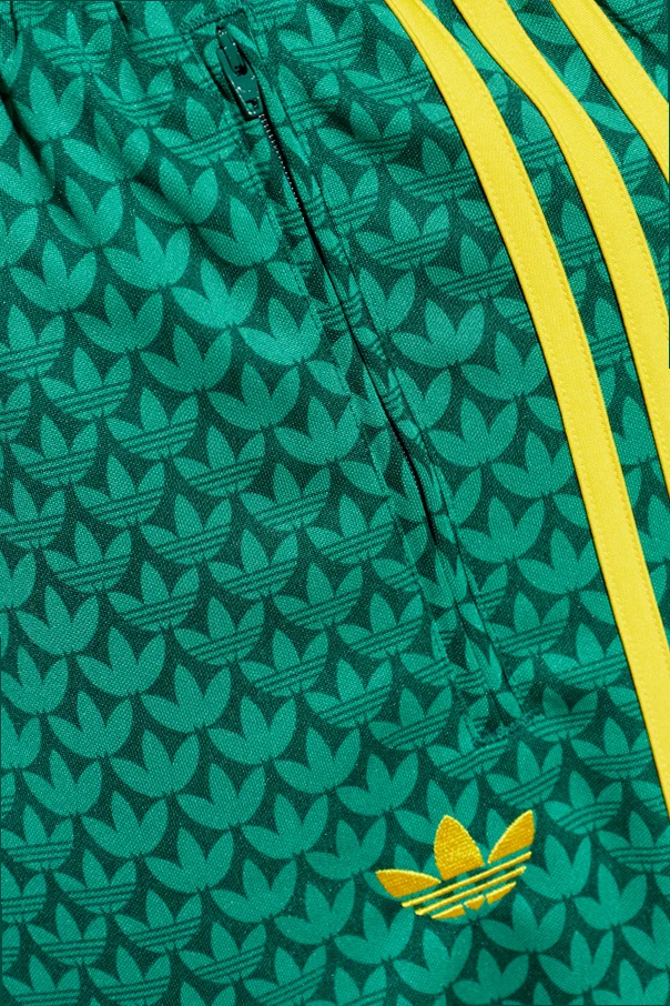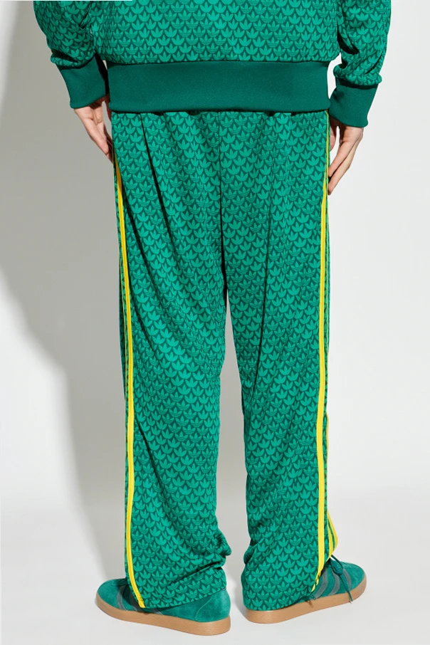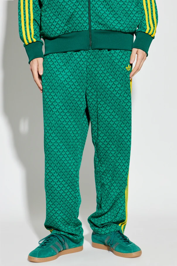 Powierzchnia spodni urzeka bogactwem monogramowego wzoru, na którym rozpościerają się powtarzające się motywy liści w tonacji zielonej . Sztandarowe trzy żółte pasy subtelnie podkreślają boczne linie, manifestując renomę marki. Dopracowanie detali ujawnia się poprzez precyzyjny haft w intensywnie żółtym kolorze, umieszczony przy lewej kieszeni.
