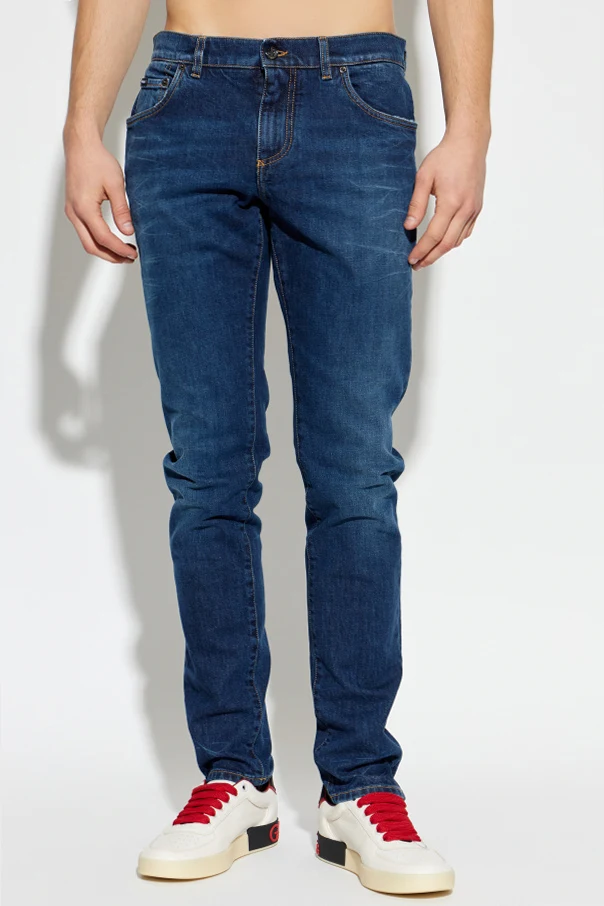 Jeansy typu Skinny od renomowanego domu mody Dolce & Gabbana to esencja włoskiej finezji i współczesnej elegancji. Precyzyjnie wyprofilowany krój z mocno zwężaną nogawką podkreśla walory sylwetki, nadając całości wyrafinowany charakter.