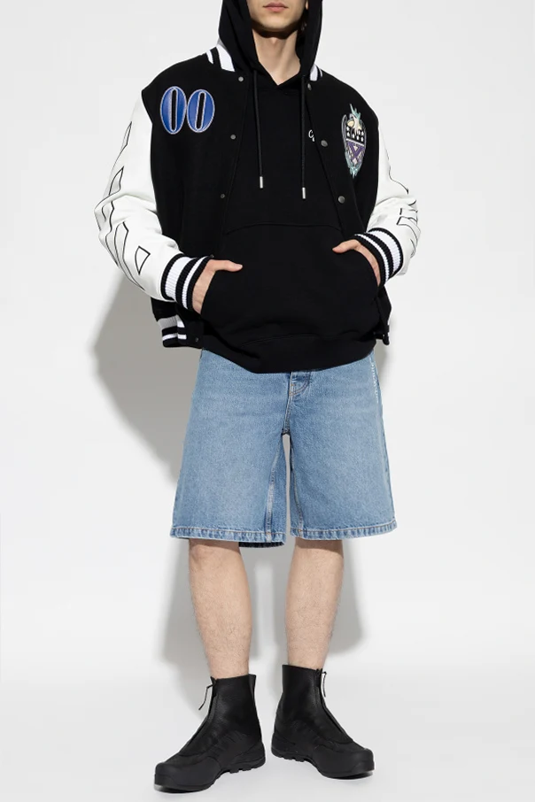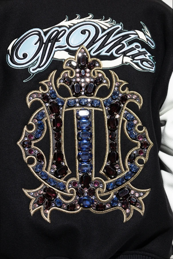 Ocieplana kurtka typu ‘Bomber’ marki Off-White stanowi wyrafinowaną interpretację klasycznej bomberki. Utrzymana w głębokim odcieniu czarnym z kontrastującymi, białymi rękawami, przyciąga wzrok geometrycznymi motywami na rękawach oraz pasami na ściągaczach. Matowa góra z ekskluzywnej wełny, wzmocniona elementami skóry, oraz przyjemna w dotyku wiskoza wewnątrz zapewniają komfort i trwałość w chłodniejsze dni.