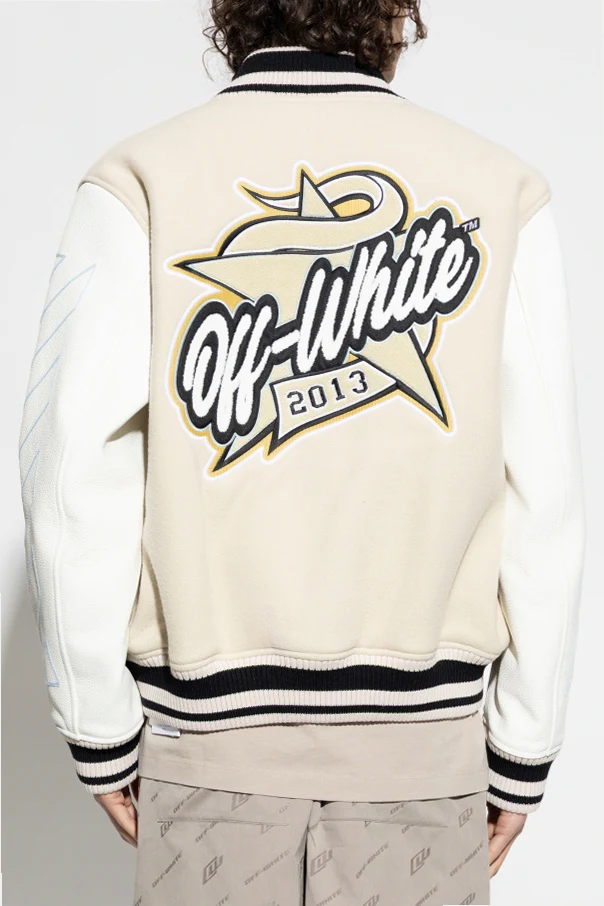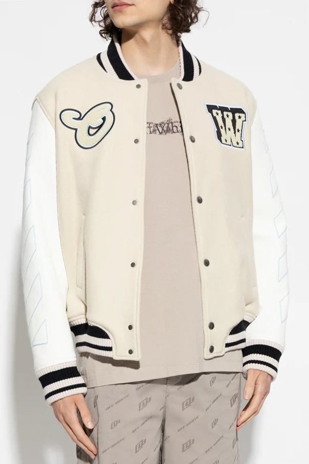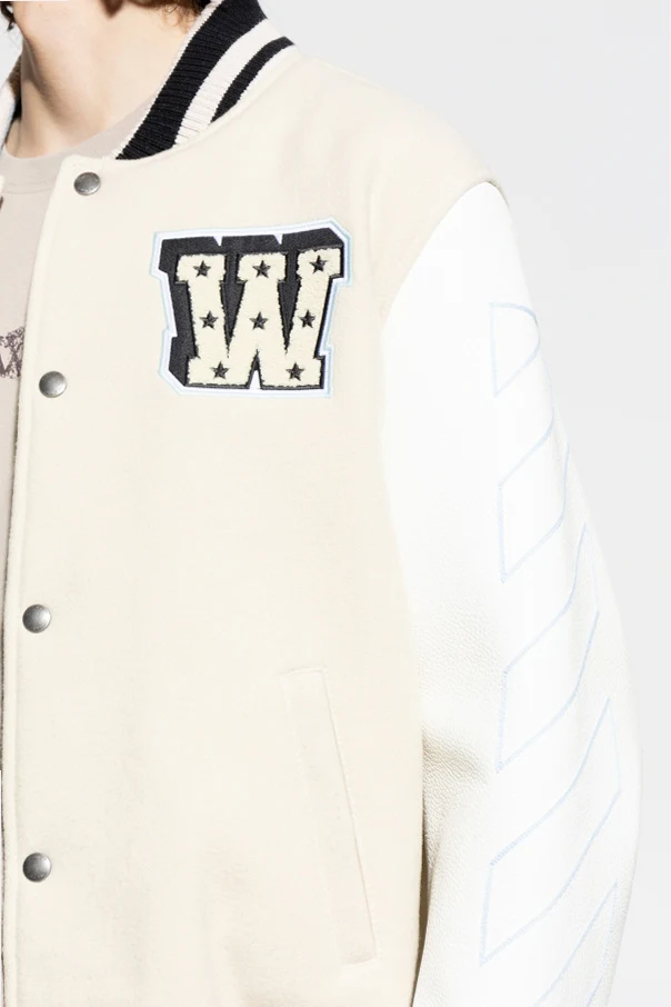 Ocieplana kurtka typu ‘Bomber’ marki Off-White to wyważona synteza sztuki krawieckiej i współczesnej ekspresji. Wyróżnia ją kremowy kolor głównej części oraz białe, dekoracyjne rękawy w geometryczne paski. Oryginalności dodają duża, wypukła naszywka z literą „W” na lewej piersi oraz starannie obszyta aplikacja po prawej stronie.