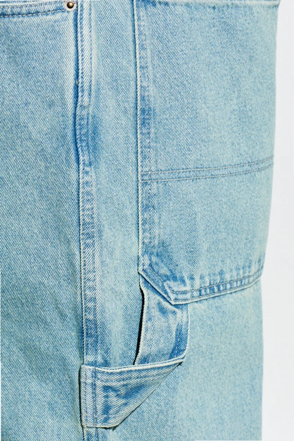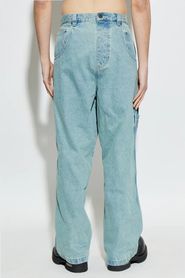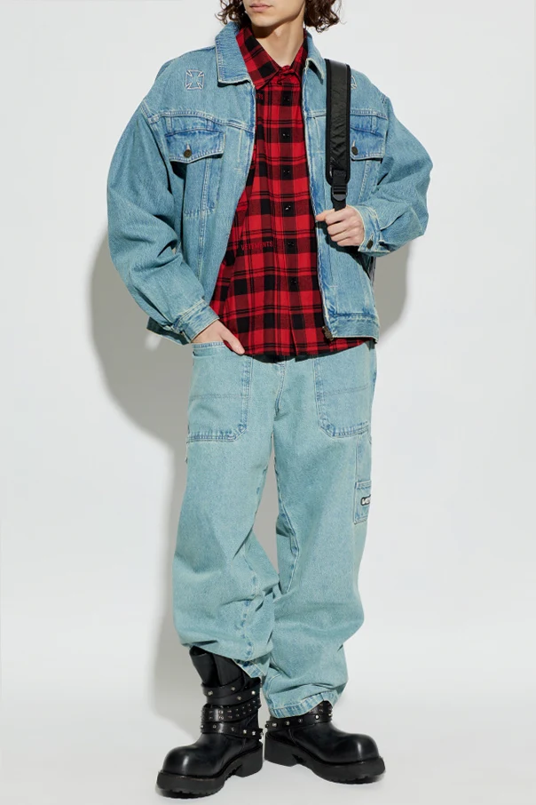 Jeansy z szerokimi nogawkami autorstwa VETEMENTS prezentują niepowtarzalne połączenie klasyki z awangardą. Kunsztownie uszyte z tradycyjnego, jasnoniebieskiego denimu, wyróżniają się prostym, szerokim krojem typu “wide leg” oraz wysokim stanem, zapewniającym zarówno wygodę, jak i wyrafinowany wdzięk sylwetki.