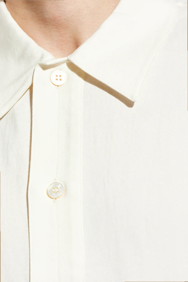 Kremowy odcień w połączeniu z gładką, matową tkaniną z wysmakowanej wiskozy i lnu tworzy szlachetny efekt, a klasyczny, szeroki kołnierzyk polo z subtelnym wykończeniem dodaje całości wyrafinowanego sznytu. Całość wieńczy krótka plisa na dwa guziki, z których górny został ozdobnie zszyty kontrastową nitką w kolorze beżowym/kremowym. Zdecydowanie wyróżnia się tu brak widocznych napisów czy logo – absolutny hołd dla czystej formy i wyważonej estetyki.