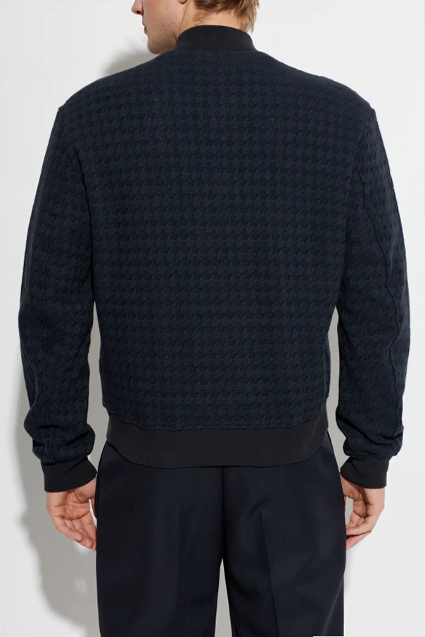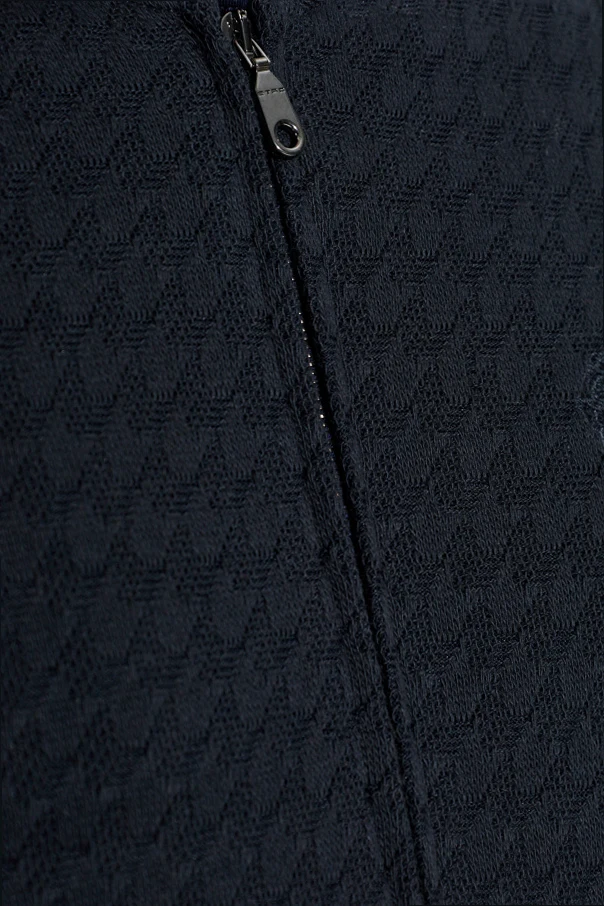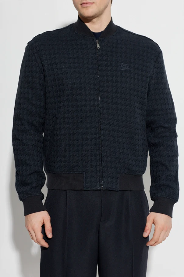 Granatowa kurtka z kieszeniami marki Etro to synonim ponadczasowej elegancji oraz wyrafinowanego stylu. Wykonana z wysokogatunkowej, żakardowej tkaniny, zachwyca szlachetną fakturą oraz strukturalnym, tłoczonym wzorem w pepitkę, który subtelnie podkreśla oryginalność projektu. Krój typu bomber, delikatnie skrócony i dopasowany dzięki elastycznym ściągaczom u mankietów, w pasie oraz przy kołnierzu, zapewnia wygodę oraz nienaganny wygląd.