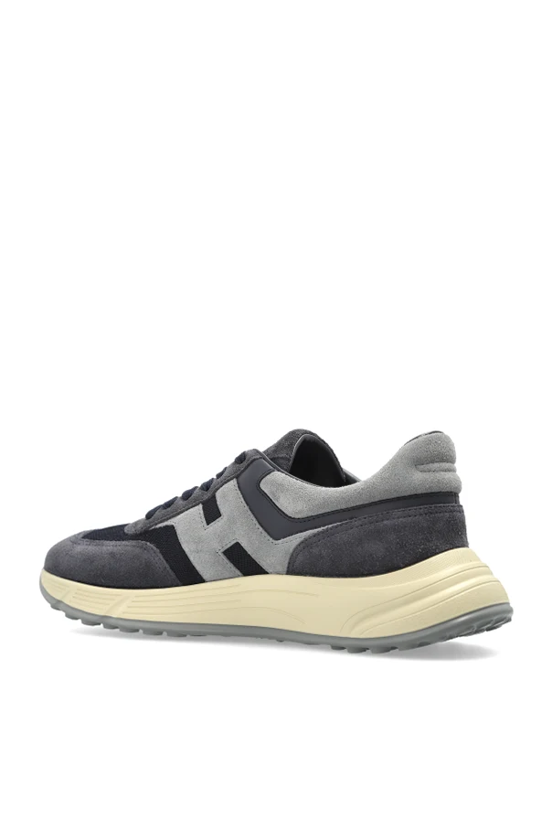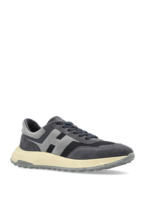 Szersza naszywka z literą „H” z zamszu oraz ciemnoszare, starannie dobrane sznurowadła stanowią elegancki akcent, charakterystyczny dla projektanta. Brak zbędnych ozdób dopełnia wyrafinowaną prostotę tego modelu.