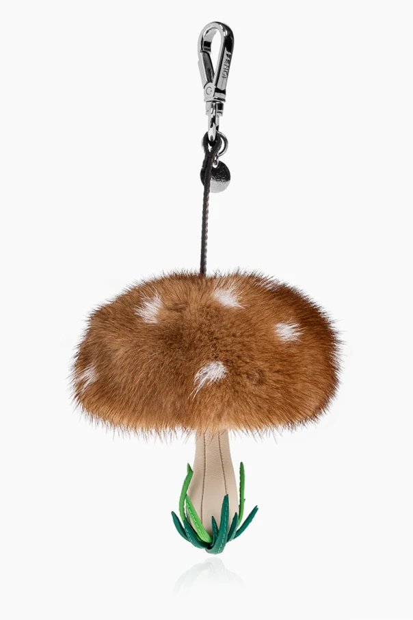 Przedstawiamy niezwykle wyrafinowaną zawieszkę do torby z motywem grzyba autorstwa renomowanego domu Fendi, wykonaną w eleganckim brązowym odcieniu. To unikatowe akcesorium olśniewa realistyczną formą muchomora – puszysty kapelusz z ekskluzywnego futra norek , ozdobiony nieregularnymi, białymi plamkami perfekcyjnie odwzorowuje urok natury. Precyzyjnie wykonany trzonek oraz subtelne liście u podstawy, ze skóry cielęcej, zachwycają miękkością oraz kunsztem detalu.