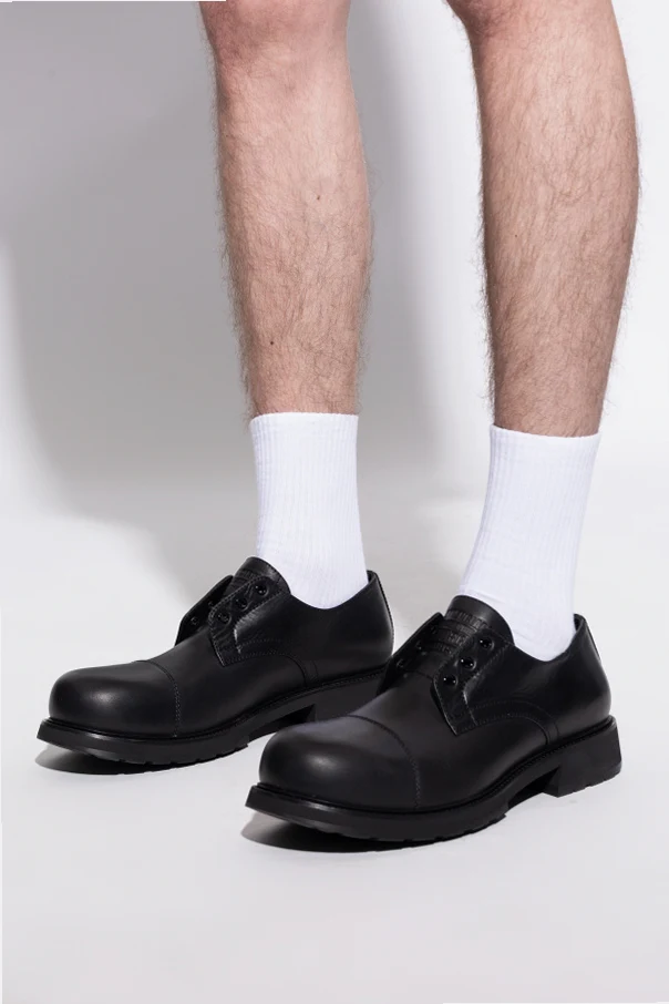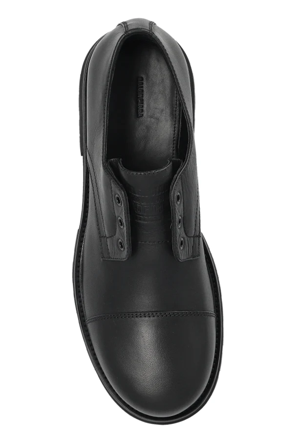 Skórzane buty Truck Derby zaprojektowane przez Balenciaga to prawdziwa esencja męskiej elegancji w nowoczesnym wydaniu. Utrzymane w kolorze czarnym , wykonane są z matowej, wysokogatunkowej skóry licowej, zachwycają gładką fakturą oraz minimalistycznym wzornictwem. Dyskretne przeszycie typu "cap toe" harmonijnie podkreśla smukły, lekko wydłużony nosek, zapewniając absolutną klasykę formy.