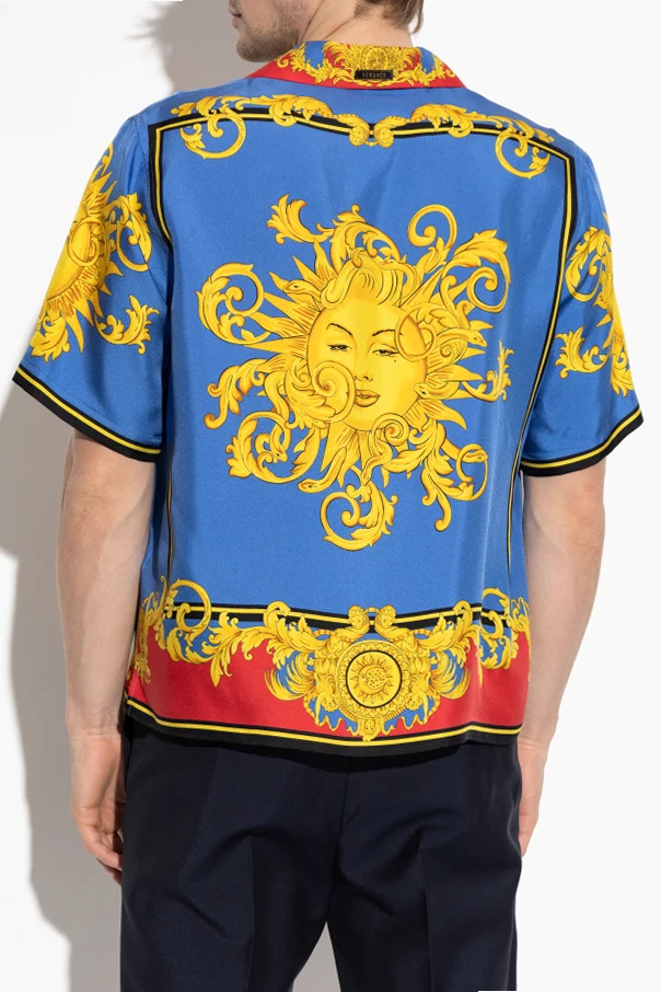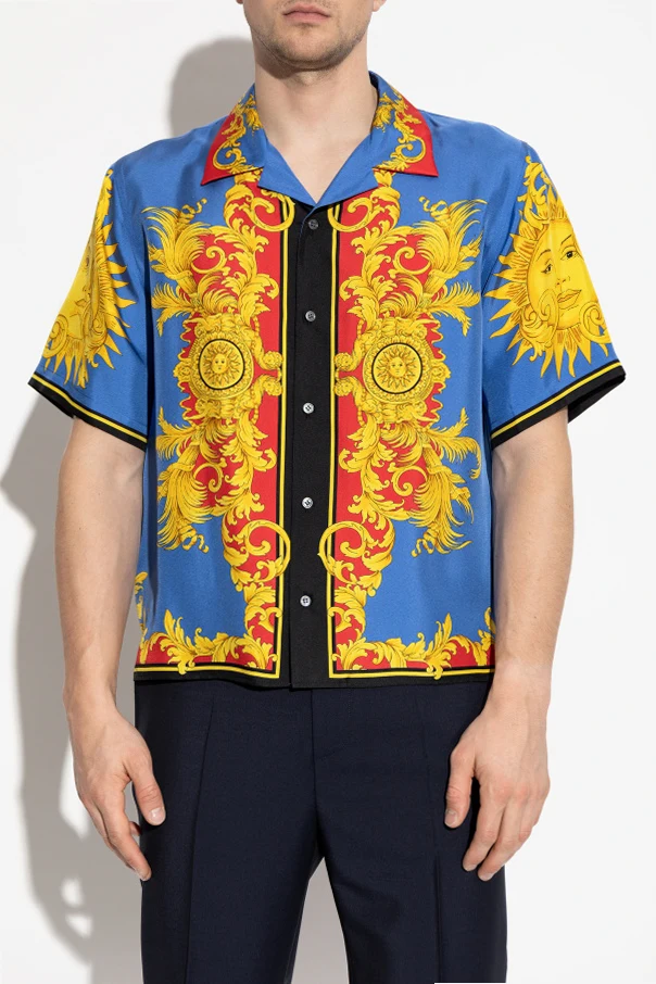 Jedwabna koszula z krótkimi rękawami marki Versace to kwintesencja wyszukanego smaku oraz doskonałego kunsztu włoskiego krawiectwa. Model o regularnym, lekko luźnym fasonie z klasycznym kołnierzykiem rewersowym i zapięciem na guziki, zachwyca niebywałą lekkością oraz szlachetnością materiału. W całości uszyta z subtelnego jedwabiu, otula ciało miękkością, gwarantując niezrównany komfort noszenia nawet podczas najbardziej upalnych dni.